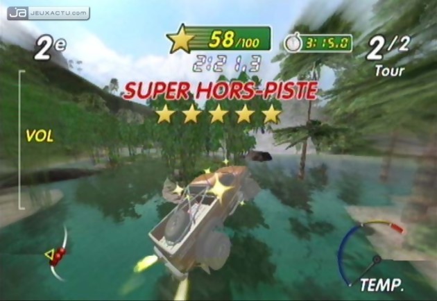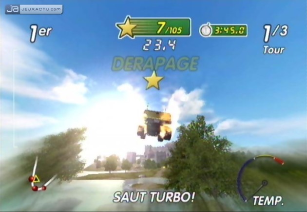 Mais le boost n’est pas le seul élément à prendre en compte pour briller en courses. Les étoiles font également partie des principaux éléments que le joueur doit prendre en considération pour remporter une course. En effet, au début de chacune des courses, il est possible de voir le nombre conseillé, parfois minimum, d’étoiles à récupérer pendant une course. Comment faire ? En conduisant de la meilleure façon possible. Planer un long moment dans les airs, prendre correctement un virage, réussir son atterrissage, passer au travers des bonus, exécuter une figure aérienne ou bien encore réaliser un magnifique crash permet de récolter ces étoiles. A l’instar de Mario Kart, il existe des bonus récupérables sur son chemin et qui permettent de devenir invincible et écraser tout ce que l’on souhaite sur son passage. Il y a aussi les tremplins dits naturels, ceux que le joueur peut provoquer en passant simplement au travers d’un bonus posé sur le circuit. Il est en effet possible de modifier la topographie du terrain, soit en faisant subitement apparaître des collines - idéales pour s’en servir comme tremplin – faire apparaître des points d’eaux ou à l’inverse créer des routes supplémentaires pour prendre un raccourci par exemple. Dommage que l’I.A. du jeu ne permette pas l’utilisation des items par les adversaires, ce qui aurait pu apporter un peu plus de challenge à l’ensemble.