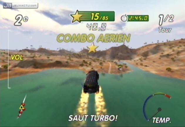 Si l’objectif premier est de franchir la ligne d’arrivée en tête afin de pouvoir débloquer les différentes circuits et autres bolides cachés, il faudra également prendre en compte l’utilisation du turbo, élément indispensable pour ne pas se faire distancer par ses concurrents. Le boost est accessible à n’importe quel moment du jeu en appuyant sur n’importe touche de la croix directionnelle. Mais afin de limiter son utilisation, les développeurs ont mis en place une jauge obligeant le joueur à mesurer la fonction de ce turbo si précieux, sous peine de faire exploser le moteur. Heureusement, quelques techniques permettent de contourner le problème. On apprend ainsi que planer dans les airs ou rouler dans l’eau permet de faire chuter la température du moteur, ce qui permet d’utiliser à nouveau le turbo. Mine de rien, l’utilisation restreinte du turbo oblige le joueur à penser stratégiquement, le forçant parfois à emprunter un chemin différent de son point de vue de départ pour espérer grappiller quelques secondes supplémentaires au chrono.