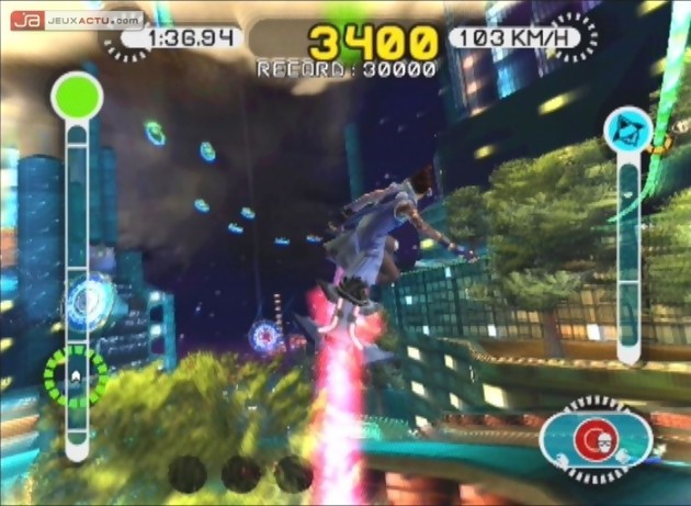 Chaque niveau dispose de son ambiance particulière, et si l’aspect graphique rappellera sûrement des souvenirs aux anciens joueurs de Trick Style, ce sont surtout les animations des environnements qui rajouteront un peu de piquant. On évite les nombreuses voitures lors d’une descente vertigineuse, on passe entre les palles d’un ventilateur, mais surtout on peut choisir son chemin grâce à des aiguillages sur certains rails. En effet, entre deux accroupissements et quatre sauts pour éviter les pancartes, on se penche et tend les bras pour attraper différents bonus et réaliser un combo qui va permettre d’accéder à une nouvelle zone. Les niveaux ne sont donc pas totalement linéaires, ce qui est assez rare pour un jeu de course et si un mode style est disponible pour faire les plus belles figures, les descentes savent proposer un effet de vitesse et une sensation de liberté assez importante, notamment avec divers passages aériens. En effet, si nous ne l’avons pas encore précisé EyeToy : AntiGrav est un jeu de hoverboard, autrement dit une sorte de skateboard en apesanteur, tel celui de Marty MacFly dans Retour Vers le Futur 2, et il vous sera alors possible de partir dans les airs, vous servant de vos bras pour voler et passer entre différents anneaux, à la manière de Knights dans Sega SuperStars, toujours sur EyeToy.