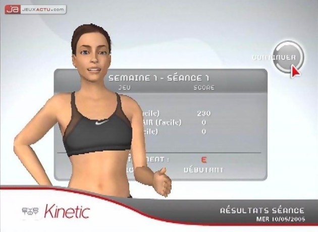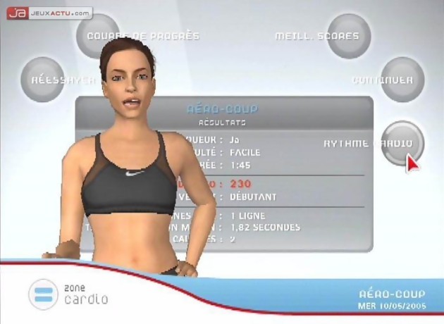 Au début de chaque épreuve, le rythme est généralement lent pour vous laisser le temps de se familiariser avec les commandes. Une jauge se remplit au fur à mesure des réussites. Une fois la jauge pleine, vous passez à un niveau supérieur et l’intensité s’accroît. Le temps est limité à quelques minutes et l’objectif est donc d’arriver au maximum de vos capacités, en l’occurrence au dixième niveau à chaque fois. A la fin des opérations, quelques tableaux de statistiques analyseront les performances et donneront des renseignements par exemple sur le nombre de calories perdues durant l’effort. Si certaines épreuves sont d’une simplicité enfantine, la plupart restent intéressantes – particulièrement ceux de la zone de combat – et pourront vous faire mouiller le maillot en moins de cinq minutes, chronomètre en main. Allez, ne soyons pas hypocrite, il faut savoir souffrir pour être beau. Et quand bien même, il ne s’agit pas de mettre sa santé en jeu et qu’on éprouve beaucoup de peine sur un exercice – les conseils du coach vont parfaitement dans ce sens d’ailleurs – mieux vaut s’arrêter ou se rabattre sur autre chose. On terminera malheureusement sur une légère note de déception. En effet, les musiques d’accompagnement, sans être mauvaises, manquent de saveur et si les graphismes ne constituent pas l’optique première du jeu – surtout que c’est votre bobine qui apparaît le plus souvent – EyeToy : Kinetic se débrouille correctement à ce niveau mais on ne pourra s’empêcher de remarquer les contours aliasés de Matt & Anna.