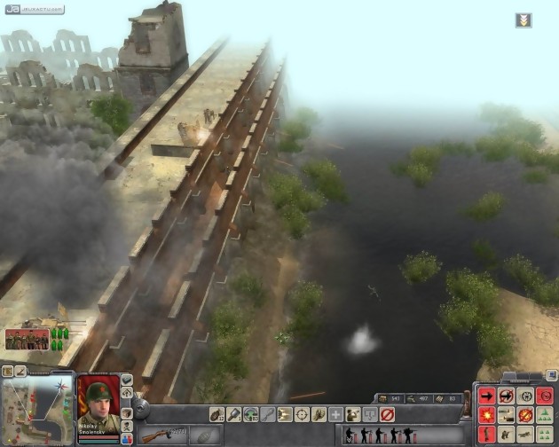 Pour tout vous avouer, lors du tutorial, nous avions un peu l’impression de nous lancer dans un Company of Heroes au micro management poussé à l’extrême. Lors du briefing de la première mission, on s’attend à un Commando-like. Trois minutes plus tard, lorsque les grenades fusent de partout que les ennemis investissent la carte par dizaines, on revit les épisodes les plus musclés de Command and Conquer. Le tas de trucs appris précédemment ne sert plus à rien, on n’arrive à peine à suivre ce qui se passe à l’écran. C’est hollywoodien. Même Peter Jackson ne mettrait pas autant d’effets spéciaux s’il faisait un film de guerre. Oui, nous sommes donc loin de l’infiltration tactique de Commandos ; mais on ne sait toujours pas vraiment ce que c’est. S’il fallait vraiment résumer en un minimum de mots, on pourrait dire STR tactique très bourrin. Peut-être l’orientation du jeu s’avérait-elle plus "Commandos" au début du projet ?... Mais en s’apercevant de la qualité du moteur graphique, il eut été dommage de ne pas parsemer une mission de 15.000 explosions en tout genre. Changement d’orientation en cours de projet ?