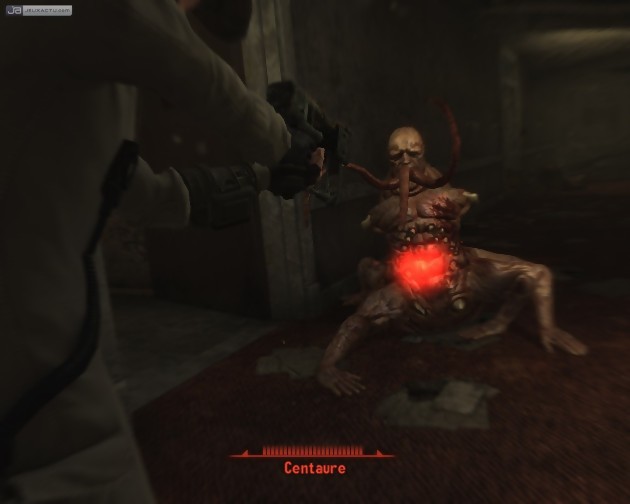 Un coup d'œil aux captures d'écran suffira à vous en convaincre : le jeu privilégie la vue subjective. Passons rapidement sur la disponibilité d'une vue à la troisième personne, qui n'a pour seul mérite que de dévoiler l'animation assez catastrophique de votre personnage, tendance "balai dans le fondement". Pour rester jouable et agréable à regarder, Fallout 3 doit donc impérativement se parcourir  à la première personne. Cela n'en fait pas pour autant un véritable FPS, car viser avec précision ne suffit pas pour terrasser l'adversaire. Les adeptes du headshot létal en seront pour leurs frais : l'efficacité des tirs dépend essentiellement des caractéristiques du héros. Heureusement, en cas de difficulté, il est toujours possible d'enclencher le Système de Visée Assistée Vault-Tec, plus communément appelé SVAV. Le jeu se met alors en pause et zoome sur l'ennemi le plus proche, détaillant l'état de santé des diverses parties de son corps et les chances de toucher chacune d'entre elles. A charge ensuite au joueur d'indiquer où il souhaite viser, et d'empiler ainsi plusieurs tirs sur les parties et les ennemis de son choix, dans la limite des points d'action qu'il possède à ce moment précis. Ces tirs seront ensuite automatiquement effectués dans l'ordre choisi et affichés à travers une séquence non-interactive se déroulant au ralenti. Ce système plutôt plaisant nous offre quelques scènes délicieusement gore... à ceci près que la caméra à tendance à se placer aux pires endroits possibles (derrière un poteau, au ras du sol...), compliquant ainsi la lisibilité de l'ensemble. Cette touche tactique vient compléter un tableau déjà fort riche en possibilités. Car aux sept statistiques primaires du personnage (Force, Perception, Endurance, Charisme, Intelligence, Agilité, Chance) viennent s'ajouter de nombreuses compétences (réparation, crochetage, médecine...) et  spécialisations  (tueur de femmes, voleur, entomologiste...). On peut donc véritablement personnaliser le héros comme on l'entend. Avoir de bonnes compétences en combat reste hélas nécessaire mais, à l'occasion, certaines situations se résoudront tout de même plus facilement par le dialogue ou par le piratage des systèmes informatiques. Signalons au passage que le hacking s'effectue à travers un mini-jeu de type Mastermind, plus intellectuel et moins lassant que le Pipemania de Bioshock.