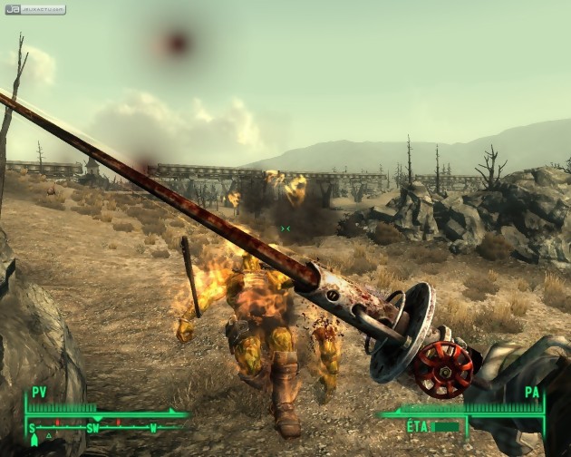 Un coup d'œil aux captures d'écran suffira à vous en convaincre : le jeu privilégie la vue subjective. Passons rapidement sur la disponibilité d'une vue à la troisième personne, qui n'a pour seul mérite que de dévoiler l'animation assez catastrophique de votre personnage, tendance "balai dans le fondement". Pour rester jouable et agréable à regarder, Fallout 3 doit donc impérativement se parcourir à la première personne. Cela n'en fait pas pour autant un véritable FPS, car viser avec précision ne suffit pas pour terrasser l'adversaire. Les adeptes du headshot létal en seront pour leurs frais : l'efficacité des tirs dépend essentiellement des caractéristiques du héros. Heureusement, en cas de difficulté, il est toujours possible d'enclencher le Système de Visée Assistée Vault-Tec, plus communément appelé SVAV. Le jeu se met alors en pause et zoome sur l'ennemi le plus proche, détaillant l'état de santé des diverses parties de son corps et les chances de toucher chacune d'entre elles. A charge ensuite au joueur d'indiquer où il souhaite viser, et d'empiler ainsi plusieurs tirs sur les parties et les ennemis de son choix, dans la limite des points d'action qu'il possède à ce moment précis. Ces tirs seront ensuite automatiquement effectués dans l'ordre choisi et affichés à travers une séquence non-interactive se déroulant au ralenti. Ce système plutôt plaisant nous offre quelques scènes délicieusement gore... à ceci près que la caméra à tendance à se placer aux pires endroits possibles (derrière un poteau, au ras du sol...), compliquant ainsi la lisibilité de l'ensemble. Cette touche tactique vient compléter un tableau déjà fort riche en possibilités. Car aux sept statistiques primaires du personnage (Force, Perception, Endurance, Charisme, Intelligence, Agilité, Chance) viennent s'ajouter de nombreuses compétences (réparation, crochetage, médecine...) et spécialisations (tueur de femmes, voleur, entomologiste...). On peut donc véritablement personnaliser le héros comme on l'entend. Avoir de bonnes compétences en combat reste hélas nécessaire mais, à l'occasion, certaines situations se résoudront tout de même plus facilement par le dialogue ou par le piratage des systèmes informatiques. Signalons au passage que le hacking s'effectue à travers un mini-jeu de type Mastermind, plus intellectuel et moins lassant que le Pipemania de Bioshock.