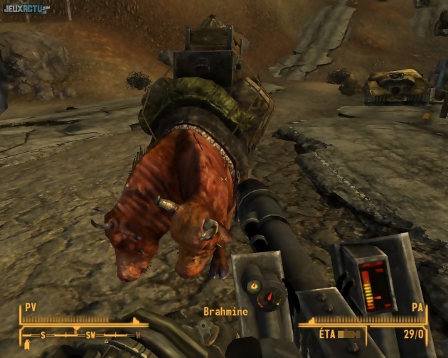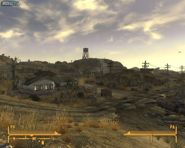 Nettement supérieur à son prédécesseur sur le fond, ce nouvel épisode de Fallout sait également innover de manière plus prosaïque. On se réjouit par exemple du fait que les combats soient nettement plus dynamiques qu'auparavant. C'est en grande partie du à l'arrivée tant attendue d'une visée à l'épaule. Utiliser l'ironsight rend les affrontements plus nerveux et évite d'avoir recours trop souvent au système SVAV. La gestion des compagnons de route a également été revue puisqu'on dispose désormais d'une roue d'ordres, qui permet d'accéder à leur inventaire, de changer leur comportement par défaut, de définir des tactiques, etc. L'intelligence artificielle n'est pas toujours parfaite, mais l'aide apportée par ces coéquipiers reste précieuse. De plus, ils sont l'occasion de bénéficier une nouvelle fois de quelques dialogues bien sentis et même, pour certains d'entre eux, d'apprécier quelques références aux premiers Fallout. Ambiance western, casino et p'tites pépées oblige, les jeux de hasard et de cartes sont de la partie. Il est non seulement possible de s'adonner au Blackjack, à la roulette ou encore aux machines à sous , mais également de disputer quelques parties de Caravan, un jeu de cartes créé pour l'occasion. Les règles ne sont vraiment pas simples à comprendre mais le jeu peut en valoir la chandelle, surtout qu'on trouve des cartes utiles pour la victoire disséminées ici et là dans de nombreux décors. Autant de détails qui participent à rendre l'univers toujours plus crédible ! En revanche, il faut bien avouer que l'immersion en prend un coup dès qu'on aborde les questions techniques. Le moteur 3D accuse son âge et affiche des graphismes d'un autre temps. La plupart des personnages ont des têtes hideuses, les animations de déplacement sont aussi souples que celles d'un robot s'étant malencontreusement assis sur un balai, certaines textures paraissent vraiment brouillonnes, et les bugs sont monnaie courante (ici un personnage glisse par simple translation pour éviter un élément de décor, là un autre court à l'infini contre un obstacle...). Qui plus est, les voix françaises manquent de conviction et, surtout, la localisation multiplie les erreurs et les contresens. Exemple flagrant : certains lézards sont appelés Chasseurs de Geckos au lieu de Geckos chasseurs. Parfois, on a également droit à un dialogue parlé totalement différent des sous-titres. Les anglophiles doivent donc impérativement choisir de jouer en VO. Les autres devront faire avec cette VF médiocre, mais qu'ils se rassurent : les qualités intrinsèques du jeu suffisent à faire oublier tous ses défauts et à nous faire vivre une grande aventure inoubliable.