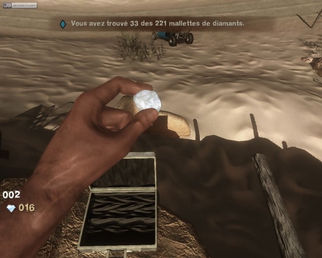 Ce principe d'affichage réaliste influe même légèrement sur le gameplay, car il concerne également les soins. Ici, pas de médikit magique à usage instantané et invisible, mais une seringue qui demande quelques instants pour être piquée et vidée. Dans les cas les plus extrêmes (à savoir lorsque la barre de vie s'approche dangereusement du zéro), notre héros doit même perdre quelques précieuses secondes pour s'extraire une balle à l'aide de son couteau, cautériser une blessure grâce à des allumettes ou se reboîter courageusement un os. Lors des combats il faut donc savoir anticiper ces soins d'urgence et trouver rapidement un abri pour les effectuer. L'anticipation est également de mise à une plus grande échelle car le personnage est atteint de malaria. Il doit donc régulièrement effectuer des missions spécifiques afin de récupérer les médicaments idoines. Par ailleurs, il sera nettement plus judicieux d'acheter légalement ses armes plutôt que de les ramasser sur les cadavres. Usées et rouillées, ces dernières ont tendance à s'enrayer au plus mauvais moment ou, pire, à vous exploser à la figure. Une manière plutôt efficace de nous faire passer régulièrement chez l'armurier, afin de dépenser les diamants durement gagnés lors des mission. Loin de se contenter du matériel de base, cet honnête commerçant nous propose également des manuels permettant d'améliorer la précision des armes, ou des éléments destinés à augmenter le nombre de seringues ou de munitions transportables. Un petit côté RPG pas désagréable !