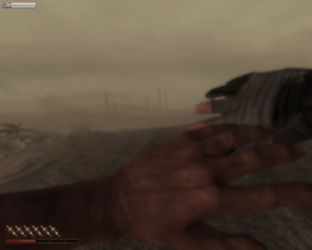 Ce principe d'affichage réaliste influe même légèrement sur le gameplay, car il concerne également les soins. Ici, pas de médikit magique à usage instantané et invisible, mais une seringue qui demande quelques instants pour être piquée et vidée. Dans les cas les plus extrêmes (à savoir lorsque la barre de vie s'approche dangereusement du zéro), notre héros doit même perdre quelques précieuses secondes pour s'extraire une balle à l'aide de son couteau, cautériser une blessure grâce à des allumettes ou se reboîter courageusement un os. Lors des combats il faut donc savoir anticiper ces soins d'urgence et trouver rapidement un abri pour les effectuer. L'anticipation est également de mise à une plus grande échelle car le personnage est atteint de malaria. Il doit donc régulièrement effectuer des missions spécifiques afin de récupérer les médicaments idoines. Par ailleurs, il sera nettement plus judicieux d'acheter légalement ses armes plutôt que de les ramasser sur les cadavres. Usées et rouillées, ces dernières ont tendance à s'enrayer au plus mauvais moment ou, pire, à vous exploser à la figure. Une manière plutôt efficace de nous faire passer régulièrement chez l'armurier, afin de dépenser les diamants durement gagnés lors des mission. Loin de se contenter du matériel de base, cet honnête commerçant nous propose également des manuels permettant d'améliorer la précision des armes, ou des éléments destinés à augmenter le nombre de seringues ou de munitions transportables. Un petit côté RPG pas désagréable !