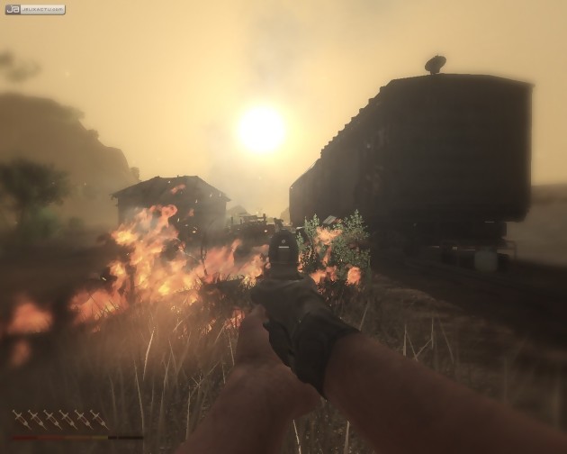 La capacité de Far Cry 2 à gérer la propagation du feu a souvent été mise en avant par les développeurs d'Ubisoft Montréal. Une fois le jeu en main, on peut raisonnablement affirmer qu'ils avaient raison d'en être fier. Sans devenir pour autant le centre du gameplay, les incendies tiennent une place toute particulière dans le jeu. L'efficacité du lance-flammes est astucieusement contrebalancée par sa propension à vous faire tenir le rôle de l'enflammeur enflammé. Le feu n'hésitant pas à embraser les constructions et la végétation environnantes, il convient donc de se méfier des réactions en chaîne. En léchant innocemment une caisse de munitions lors de sa progression, une flamme pourra par exemple déclencher un feu d'artifice assez désagréable pour quiconque se trouverait dans les parages. Ou encore : un véhicule trop proche d'une jeep qui explose imitera aussitôt sa voisine... Hormis ce cas extrême, les dégâts que ne manquent pas de subir les véhicules lors des accidents ou des fusillades peuvent toujours être réparés. Il suffit pour cela de donner un tour de clé à mollette sur le moteur. Comme toutes les autres, cette action est représentée à l'écran par une animation spécifique. Débarrassée de tout raccourci artificiel, la vue subjective n'en est que plus immersive. Ouvrir une porte, accepter un dossier de la main d'un chef de faction, passer du siège conducteur au poste de mitrailleur dans une jeep, tout est prétexte à l'affichage réaliste de l'action en cours. La carte routière constitue le point d'orgue de ce choix esthétique puisqu'elle n'apparaît jamais en plein écran mais toujours dans la main du personnage.