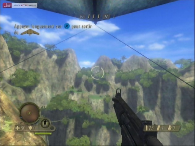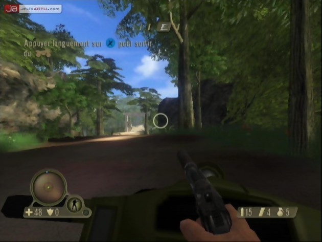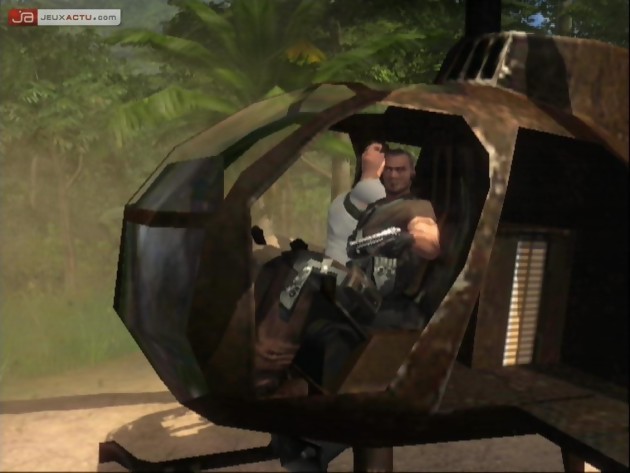 Où est le problème, me direz-vous ? Far Cry Instincts est beaucoup trop facile, vous rétorquerai-je. Et outre un manque de challenge évident, cette aisance déconcertante à avancer dans les niveaux noie les bonnes intentions issues des possibilités de gameplay varié. Là où nous annonçait une bonne dose d’infiltration, il n’y a que du très classique rentre-dedans. Pourquoi se fatiguer à poser des pièges, ramper sous les huttes et à prendre gare à ne pas faire se repérer là où le bon vieux rentre-dedans des familles est amplement suffisant. L’indicateur du niveau d’alerte des ennemis n’est alors plus utile et le fait que le viseur se teinte de rouge une fois un ennemi en mire nous permet même de tirer à l’aveugle sans prendre de gros risques. On avance, on tire dans le tas et on compte les cadavres, l’I.A. parfois défaillante n’étant pas là pour nous causer de véritables soucis. Entre les soldats qui se laissent allègrement tirer dessus ou les snipers qui se rapprochent de vous, les comportements laissent parfois à désirer. Pis, une fois transformé en mutant, vous regagnez constamment de la vie et la profusion des munitions et des kits de santé vous assure une progression désarmante de facilité. Il y a certes deux trois combats face à de gros mutants et un affrontement final un peu plus corsé, mais la sensation de parcourir des kilomètres sans réelle opposition est omniprésente. De plus, on regrettera un level design finalement très classique et n’hésitant pas à réitérer une situation donnée plus qu’il n’en faut. Les exemples sont légion dans le domaine, un des plus frappants étant un passage dans la jungle où vous croisez une première fois un groupe d’ennemis suivis par un sniper perché sur un arbre. OK, sympa à défaut d’être original, la séquence fonctionne plutôt bien. Deux minutes plus tard, nouveau groupe d’ennemis accompagnés d’un sniper sur un arbre. Mouais… Deux minutes plus tard, devinez ce qui se profile ? J’imagine que vous tenez la réponse… Si vous ajoutez à cela une musique vite insupportable, mes compagnons de bureau me regardant d’un œil de plus en plus sombre au fil des heures passées sur le jeu, vous comprendrez que Far Cry Instincts est loin d’être le hit annoncé.