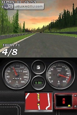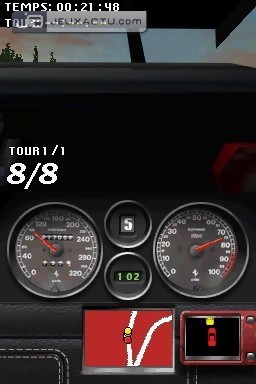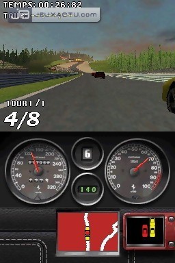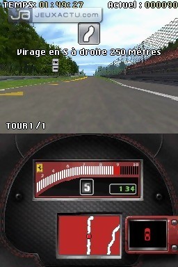 Le gameplay de Ferrari Challenge autorise une prise en main immédiate, et ne nécessite pas un sens aiguë du pilotage. La seule difficulté réside dans le fait de jeter de temps en temps un coup d'oeil sur l'écran du bas pour anticiper les virages, c'est tout. La vue par défaut - subjective - demeure suffisamment claire pour appréhender le relief des huit circuits. En Versus, il est possible de jouer en single card comme il est de rigueur sur DS, pour des courses jusqu'à quatre joueurs. On termine le tour du propriétaire par le mode Challenge Cards, un jeu de cartes dans lequel il va falloir récupérer toutes celles de son adversaire. Le concept est on ne peut plus simple : chaque joueur tire une carte sur laquelle est représentée un modèle de véhicule, ainsi que ses caractéristiques techniques. Le joueur qui a la main doit désigner l'une d'elles - année de fabrication, moteur, prix... -, et c'est celui qui possède la plus grande valeur qui remporte la carte du joueur d’en face. Si le prix est le critère sélectionné par exemple, celui qui possède la voiture la plus chère remporte la mise. C'est en gagnant les différents défis proposés dans Ferrari Challenge que l'on pourra gonfler son paquet de cartes. L'ambiance sonore du jeu est médiocre, avec des Ferrari qui miaulent au lieu de rugir. Même les voix-off sont au bout du rouleau, sans oublier les thèmes musicaux qui deviennent rapidement répétitifs. La réalisation ne verse pas non plus dans l'excellence, même s'il faut garder à l'esprit que l'on est sur DS. Du coup, le car design s'avère très moyen, de même que les environnements qui ressemblent parfois à un amas de pixels. Les tracés ont du relief - c'est déjà ça -, s'inspirent même des originaux, mais les courbes manquent de rondeur et arborent des angles droits peu séduisants.
