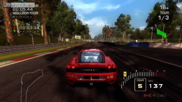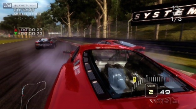 Inutile d’emprunter des chemins sinueux pour vous confirmer que les sensations de pilotage de Ferrari Challenge ne sont guères convaincantes. Sur le papier, Ferrari Challenge : Trofeo Pirelli propose une conduite à mi-chemin entre arcade et simulation. Un choix assez bâtard que d’autres licences telles que Project Gotham Racing ou bien encore TOCA Race Driver n’ont pas hésité à promouvoir, et qui permet de rallier un maximum de personnes à une même cause. Néanmoins, une fois sur la route, on se rend compte que le titre de System 3 a tout de même un net penchant pour l’arcade. Ce n’est pas forcément un mal mais la physique parfois douteuse des véhicules nous amène à penser que Eutechnyx est loin de faire honneur à la réputation que Ferrari Challenge : Trofeo Pirelli tente de faire passer. Prudent lors des premiers tours, le joueur remarquera qu’il n’est pas nécessaire de freiner 100 mètres avant un virage pour pouvoir l’appréhender correctement. En effet, en titillant le bouton (ou la pédale) d’accélération, il est possible de se positionner dans des trajectoires toutes aussi convenables pour ne pas finir encastré dans le mur en face. A ce sujet, afin de profiter pleinement des quelques qualités que propose le gameplay du jeu, mieux vaut désactiver les assistances à la conduite, imposées par défaut. Ainsi, le joueur avide de sensations pourra se sentir un peu libre dans ses manœuvres mais qui resteront, quoiqu’il arrive, inférieures aux autres productions de la catégorie.