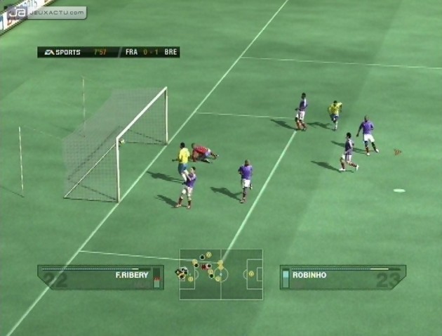 Parlons-en de ce gusse. Depuis FIFA 06 : ERCM et Coupe du Monde de la FIFA 2006, on va dire qu’il a évolué, ça fera plaisir aux développeurs. Mais dans la pratique, on a du mal à lui faire confiance. Si pendant les duels en face à face, il a enfin compris qu’il n’était pas nécessaire de sortir de ses cages pour piquer le ballon à l’attaquant, on ne peut pas en dire autant lorsque les actions se déroulent devant sa surface. C’est surtout lors de ses sorties qu’il nous fait terriblement peur car ses dégagements sont plutôt alambiqués. Comprenez par là, qu’il dégagera à la mormoileneu jusqu’à bazarder la balle devant ses cages avec une claquette des moins expertes. Ce problème ne serait qu’un détail si seulement le changement de joueur était vraiment opérationnel durant les séquences défensives. Les amateurs du changement manuel vont s’arracher les cheveux lorsque l’adversaire récupèrera le ballon. Il faudra marteler le bouton LT pendant un bon bout de temps pour incarner le défenseur adéquat à la situation. Mais pendant ce temps, l’attaquant vous aura mis un vent. A La rigueur, il est préférable d’opter pour un changement automatique afin de minimiser la casse. Et quand bien même vous parviendrez à coller l’adversaire, les récupérations de balle ne sont guère concluantes. Le jeu semble régi par les lois des contres favorables et des coups de billard. Puisqu’on parle du gameplay, sachez également qu’il est impossible de configurer le déplacement des joueurs sur la croix multidirectionnelle. Celle-ci est utilisée pour activer certaines techniques en jeu. Encore une fois, EA Canada a fait les choses à moitié.