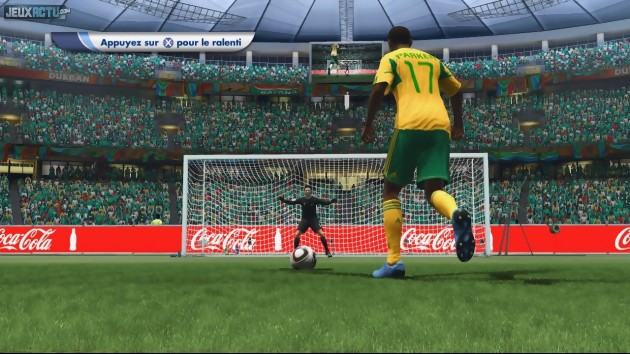 Enfin, on n'oubliera pas de signaler la présence d'un tout nouveau système de tirs au but qui impose un passage par la case "Entraînement" pour en saisir toutes les finesses. Plus concrètement, chaque joueur dispose d'une jauge qui mesure son état de stress au moment de frapper au but. L'objectif consiste à presser le bouton lorsque le curseur se trouve dans la zone verte afin que la frappe soit cadrée, en prenant soin bien évidemment de doser l'inclinaison du stick. Pour corser l'affaire, plusieurs paramètres sont pris en compte comme le profil du joueur - est-il généralement désigné pour tirer les penalty par exemple - ou l'importance du match, ce qui influence la vitesse de déplacement du réticule. Les plus vicieux pourront même casser leur prise d'élan pour dérouter le gardien - que l'on contrôle avec le stick droit -, une friandise que l'on prend un malin plaisir à savourer pour chambrer les potes. Il est fort à parier que quelques-uns de ces ajustements et nouveautés feront leur apparition dans FIFA 11, puisque Electronic Arts peut désormais se permettre d'avancer par petites touches. En termes de réalisation, Coupe du Monde de la FIFA : Afrique du Sud 2010 éclate les yeux avec des couleurs qui défilent à l'écran par milliers, Coupe du monde oblige. On ne compte même plus les papelitos qui inondent le terrain, et écouter les hymnes nationaux juste avant le début de la rencontre est toujours un grand moment dans la vie d'un footballeur, surtout quand on l'a vécu soi-même. Les développeurs auraient pu se reposer sur leurs lauriers et sortir le character design de FIFA 10, mais certains visages ont été remaniés, surtout ceux des stars les plus connues. Eric Abidal ne ressemble toujours pas à grand chose, c'est vrai, mais on félicite le travail fait sur Steve Mandanda, Franck Ribery ou bien encore Yoann Gourcuff en ce qui concerne les Bleus ; Fernando Torres, Arjen Robben, Andrea Pirlo et Kaka pour les autres sélections nationales. On a même droit à la modélisation de l'entraîneur de chacune des équipes, la preuve ultime que Coupe du Monde de la FIFA : Afrique du Sud 2010 a pensé à tout. En revanche, les focus sur les supporters sont vraiment ignobles et mettent en exergue des saccades qui gâchent le spectacle. Heureusement que la qualité des stades laisse supposer qu'il s'agit-là d'une faute de goût, sinon on aurait pu croire que c'était de l'incompétence.