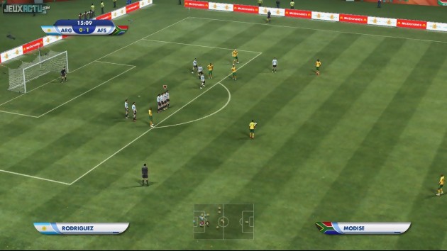 Pour être honnête, ça fait un moment que l'on n'a plus allumé le rétroprojecteur de la rédac' pour fermer quelques bouches à FIFA ; mais tout le monde s'accorde à dire qu'Electronic Arts est le roi incontesté du football virtuel à l'heure actuelle. Alors lorsque Coupe du Monde de la FIFA : Afrique du Sud 2010 débarque au bureau, on s'attend forcément à du lourd, même si l'effet de surprise est moindre que pour FIFA 10. On retrouve ainsi la fameuse conduite de balle à 360° qui permet de faire des merveilles dans un périmètre réduit, avec une souplesse dans les dribbles toujours aussi grisante. Le jeu a gagné en dynamisme et multiplier les passes pour déstabiliser la défense adverse devient un jeu d'enfant. Dès lors, on peut croire que la prise en main de Coupe du Monde de la FIFA : Afrique du Sud 2010 a été pensée pour le grand public, d'autant plus que les contrôles ne sont pas aussi subtiles qu'en 2009. Même si les joueurs ne se retournent pas dans le sens du but adverse à la vitesse de la lumière comme c'est le cas chez la concurrence, on regrette qu'il ne faille pas beaucoup plus de doigté pour mettre proprement le pied sur le ballon et crocheter le joueur d'en face. Une sensation de légèreté pas franchement agréable à vrai dire, alors que l'inertie des courses avait déjà été allégée l'an passé. Il ne faudra pas non plus s'attendre à faire systématiquement la différence avec un joueur doué techniquement entre les mains : l'impact physique a toujours son mot à dire dans Coupe du Monde de la FIFA : Afrique du Sud 2010, peut-être même plus que dans FIFA 10. Lancés en profondeur, les Thierry Henry, Didier Drogba, Cristiano Ronaldo et autres Wayne Rooney sont irrattrapables, les fameux "tout droit" de Lolo qui offrent l'occasion de gratter quelques buts gratuitement. Bref, le jeu présente quelques facilités susceptibles de faire grincer des dents les puristes, mais il est difficile de remettre en cause la cohérence du système qui intègre certaines retouches déjà apportées à FIFA 10. Comprenez par là que les arbitres retenus pour la Coupe du monde se montrent beaucoup moins laxistes et n'hésitent pas à sortir le carton rouge en cas de tacle par derrière. Même si elle n'est pas encore parfaitement maîtrisée, la règle de l'avantage est en tout cas mieux appliquée dans Coupe du Monde de la FIFA : Afrique du Sud 2010, pour éviter de ruiner bêtement une occasion de but. Pfiou !