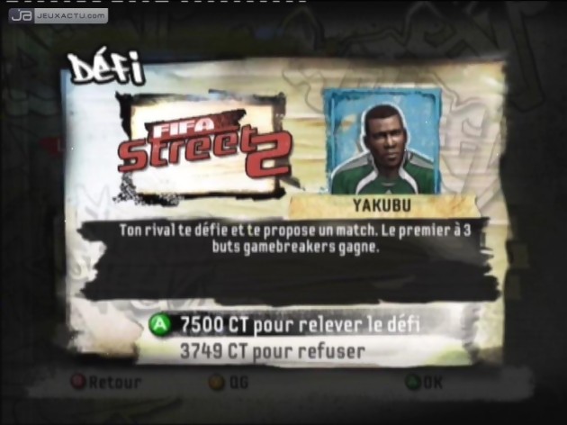 Il y a plusieurs manières d’aborder un jeu la première fois afin d’en faire le test. Tandis que certains aiment passer de longues minutes dans les menus pour fouiller les options (spéciale dédicace à Bertrand), d’autres préfèrent rentrer cash dans le feu de l’action, quitte a n’aller que plus tard dans ces mêmes menus pour modifier ce qui pourrait demander de l’être. Pour FIFA Street 2, le premier contact se fait directement à travers un match rapide entre deux équipes nationales et la première impression ne fut pas forcément des plus enthousiastes. Trop similaire à son prédécesseur, cette suite ne présentait que peu de nouveautés et mis à part l’heureuse absence des commentaires agaçants passés, remplacés ici par une BO tonitruante, on se demandait ce qu’elle pouvait apporter de plus. Heureusement, cette impression ne fut que temporaire et, une fois les subtilités du nouveau gameplay découvertes grâce au mode carrière, les arômes de FIFA Street 2 pouvaient enfin se libérer pour mieux nous faire déguster un titre qui mérite, contre toute attente, plus qu’un simple détour. Débutant votre carrière en tant qu’amateur, rejoignant les équipes qui veulent bien de vous aux différents coins du globe, vous allez devoir vous forger une réputation avant de pouvoir monter votre propre équipe et gérer les différents problèmes qui en incombent. En effet, gérant vos gains gagnés lors de chaque affrontement pour booster vos joueurs, il vous faudra aussi donner des rallonges aux footballeurs le méritant pour ne pas les perdre ou parfois savoir vous en séparer si la note parait trop salée. Totalement aléatoire, cette partie gestion ne sert que de pause entre deux matchs et on n’y consacrera guère plus qu’une poignée de secondes pour ne retourner que plus vite sur le terrain.