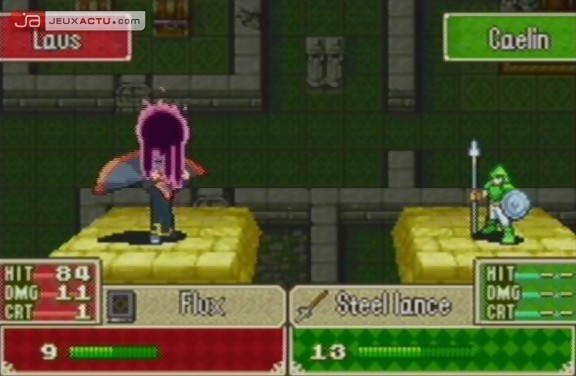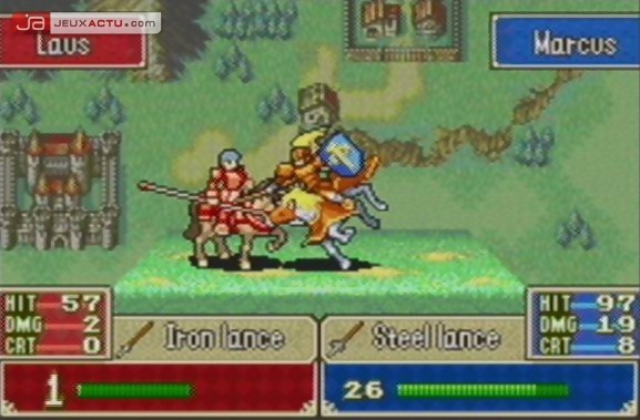 C’est donc maintenant qu’on se lâche dans les superlatifs : Fire Emblem est génial, il possède une richesse de jeu impressionnante (qui égale en fait Final Fantasy Tactics), et des graphismes super trognon comme dans Advance Wars. A chaque combat, on a droit à une jolie petite animation qui vous montrera plus en détails à quoi ressemblent vos combattants, et certains d’entre eux ont vraiment la classe ultime. On retiendra surtout les magies, superbes, Lyn et son épée Mani Katti qui fait des ravages, les cavaliers, les pégases, tout est vraiment bien animé et joliment dessiné. De la belle 2D comme en voit plus que sur GBA.