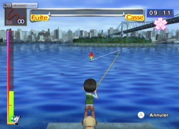 Ce n’est un scoop pour personne, les simulations de pêche sont assez barbantes, surtout quand il faut patienter des heures durant avant qu’un poisson ne vienne accrocher l’hameçon. Conscient de cet handicap, Hudson Soft a décidé de ne pas opter pour la simulation, plus réaliste certes mais moins efficace, surtout quand il s’agit de séduire un public large où la prise de gros se doit être quasi immédiate. Ce n’est donc pas un hasard si le temps et les saisons sont accélérés dans le jeu. Car il faut bien avouer que pour parcourir l’ensemble du littoral japonais, il va falloir faire preuve d’endurance et d’abnégation. En effet, hormis un compagnon canin, au choix en début de carrière, les promenades ne seront guère bavardes. Mais là ne réside pas l’intérêt du jeu, l’objectif étant d’attraper un maximum de poissons, si possible avec un choix le plus varié afin de remplir son catalogue et se targuer de devenir le pêcheur le plus en vogue de l’archipel nippon. Il s’agit du carnet de pêche où il est possible de cataloguer pas moins de 100 espèces de poissons différents ; rien de plus. Evidemment, l’intérêt devient subitement limité, et tous ceux qui espéraient varier les plaisirs risquent de déchanter. Fort heureusement, pour combler ce vide, la jouabilité proposée dans Fishing Master se montre beaucoup plus intéressante que les autres jeux de pêche. Après un rapide tutorial, on prend le pli assez rapidement et réaliser les gestes de la véritable pêche devant son écran devrait ravir tous ceux qui ne peuvent partir sur les bords de mer les week-end de Pâques. Alors que certains titres pêchent par leur manque d’ergonomie et une reconnaissance des mouvements hasardeuse, voire même parfois absente, Fishing Master se manie avec une assez belle précision, ce qui mérite d’être souligné. Dommage que les gestes, malgré une certaine subtilité, se limitent à quelques lancers et du moulinage pour ramener sa proie. Car soyons honnêtes, on a fait rapidement le tour de la question au bout de quelques parties. On pourrait alors compter sur la réalisation pour faire passer la pilule mais rien à faire, Fishing Master fait partie de ces petits jeux, développés en quelques mois et qui rappellent que la Wii continuera à faire dans le minimum syndical, tant que le grand public n’aura pas une certaine exigence.