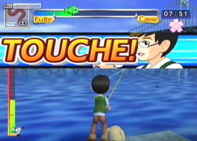 Ce n’est un scoop pour personne, les simulations de pêche sont assez barbantes, surtout quand il faut patienter des heures durant avant qu’un poisson ne vienne accrocher l’hameçon. Conscient de cet handicap, Hudson Soft a décidé de ne pas opter pour la simulation, plus réaliste certes mais moins efficace, surtout quand il s’agit de séduire un public large où la prise de gros se doit être quasi immédiate. Ce n’est donc pas un hasard si le temps et les saisons sont accélérés dans le jeu. Car il faut bien avouer que pour parcourir l’ensemble du littoral japonais, il va falloir faire preuve d’endurance et d’abnégation. En effet, hormis un compagnon canin, au choix en début de carrière, les promenades ne seront guère bavardes. Mais là ne réside pas l’intérêt du jeu, l’objectif étant d’attraper un maximum de poissons, si possible avec un choix le plus varié afin de remplir son catalogue et se targuer de devenir le pêcheur le plus en vogue de l’archipel nippon. Il s’agit du carnet de pêche où il est possible de cataloguer pas moins de 100 espèces de poissons différents ; rien de plus. Evidemment, l’intérêt devient subitement limité, et tous ceux qui espéraient varier les plaisirs risquent de déchanter. Fort heureusement, pour combler ce vide, la jouabilité proposée dans Fishing Master se montre beaucoup plus intéressante que les autres jeux de pêche. Après un rapide tutorial, on prend le pli assez rapidement et réaliser les gestes de la véritable pêche devant son écran devrait ravir tous ceux qui ne peuvent partir sur les bords de mer les week-end de Pâques. Alors que certains titres pêchent par leur manque d’ergonomie et une reconnaissance des mouvements hasardeuse, voire même parfois absente, Fishing Master se manie avec une assez belle précision, ce qui mérite d’être souligné. Dommage que les gestes, malgré une certaine subtilité, se limitent à quelques lancers et du moulinage pour ramener sa proie. Car soyons honnêtes, on a fait rapidement le tour de la question au bout de quelques parties. On pourrait alors compter sur la réalisation pour faire passer la pilule mais rien à faire, Fishing Master fait partie de ces petits jeux, développés en quelques mois et qui rappellent que la Wii continuera à faire dans le minimum syndical, tant que le grand public n’aura pas une certaine exigence.