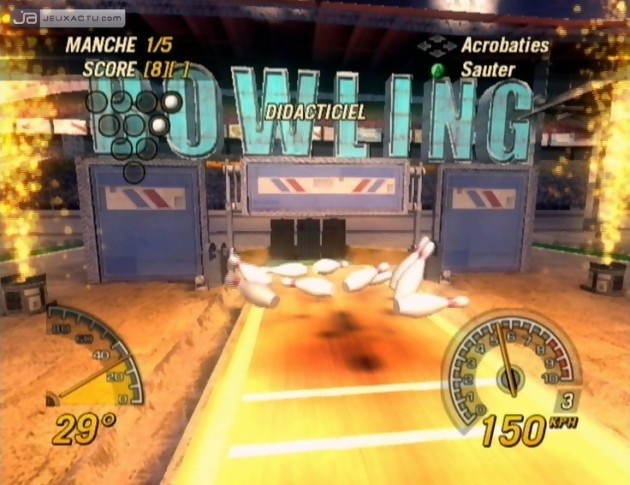 Parlons-en des courses ! Le Mode Carrière se découpe en trois épreuves bien distinctes : Derby, Courses et Rues. Au fur et à mesure de votre progression, vous pourrez concourir sur des circuits de plus en plus urbains et utiliser des bagnoles bien plus impressionnantes. Mais d’abord, vous devrez vous faire la main avec des voitures de Derby, tout rouillées, prêtes à rendre l’âme à tout moment et sentant le chien mouillée. Au défaut d’être esthétiques, elles ont le mérite d’être suffisamment robustes pour tenir 3 à 4 laps à la différence des automobiles de courses ou des sportives plus rapides mais aussi plus fragiles. Et si vous commencez avec un vieux tacot, sachez qu’il sera possible par la suite d’en acheter des nouveaux mais aussi d’améliorer leurs compétences en faisant un détour par le Mode Atelier Améliorations. Freins, moteur, suspensions, boîte de vitesse, échappement, pneus et châssis permettront un gain de vitesse ou d’une endurance. Cependant, certains choix réduiront d’autres statistiques. Quelques sacrifices sont donc envisageables. Pour pouvoir ramasser un maximum de thunes, c’est sur les circuits qu’il faudra faire ses preuves soit en remportant les différentes épreuves, soit en étant le plus rapide au tour ou soit en étant le plus dévastateur. Toujours est-il que même dans la défaite pour pouvez remporter une petite somme d’argent. Mais cela ne vous permettra pas de débloquer de nouveaux championnats, voitures ou évènements. Les évènements, ce sont ces petits défis déjà vus dans FlatOut qui permettaient d’expédier son pilote le plus haut, le plus loin et le plus fort possible sur des cibles. Et bien dans FlatOut 2, on retrouve ce même principe avec bien entendu des épreuves inédites. Aux côtés des arènes dignes de Destruction Derby, on retrouve le saut en hauteur, le bowling, le saut à ski, le curling, les anneaux de feu, le basket-ball, le royal flush, le football américain, la cible de fléchettes, le football ou le baseball. Bref rien de tel pour se décontracter le cerveau après un long championnat épuisant et crispant à cause de quelques défauts.