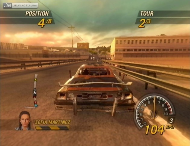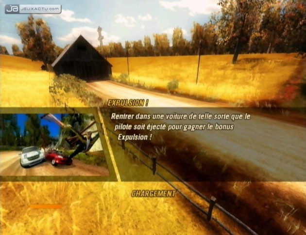 Ainsi donc les casse-cous de la première heure ne seront pas dépaysés par la conduite très arcade de ce FlatOut 2 qui puise sa force dans l’utilisation de la jauge de Nitro. A la manière des Burnout, des NFS Underground et bien d’autres jeux de courses encore, vous pouvez à tout moment pousser le régime moteur de votre bolide afin de grappiller quelques places supplémentaires grâce à une vitesse de pointe améliorée. Mais comme toutes les bonnes choses, il ne faut pas être trop gourmand. A défaut de faire une crise de foie, vous allez crier famine en martelant comme un beau diable le bouton de boost. Et c’est là l’aspect doucement stratégique de la série : savoir utiliser à bon escient cette énergie épuisable. Si d’emblée, on a tendance à appuyer sur le champignon en pleine ligne droite pour griller ses adversaires, c’est souvent peine perdue car eux aussi ont la même technique de jeu. Il est donc plus intelligent de booster lorsque ces derniers ne s’y attendent pas. Donc si accélérer dans une avenue n’est pas la meilleure solution, mettre la gomme en amorçant un virage peut s’avérer fort utile pour ne pas perdre de vitesse et gagner quelques km/h de plus au compteur. Un virage mal négocié et ce sont souvent 3, 4 voire 5 places que vous perdez en un instant. Bien que très arcade, il faut savoir bien décélérer dans une courbe pour mieux accélérer ensuite. Le frein ne sert vraiment qu’en dernier recours, lorsque votre voiture tire tout droit ou s’enfonce dans la nature après avoir percutée une barrière. Mais comment faire lorsque cette jauge d’accélération est à sec ou même dans un premier lieu réussir à la remplir ? Tout simplement en défonçant tout ce qui traîne sur votre passage. Qu’il s’agisse des décors destructibles des circuits ou des voitures adversaires, tout est bon à prendre de plein fouet. Il en est de même pour les sauts et les cascades involontaires. Plus la manœuvre est importante, plus la jauge se remplit. Pas besoin de sortir de l’ENA pour comprendre la vitesse est votre meilleure arme dans ce cas-là. Tout accident de la route est gratifié d’un nombre d’étoiles plus ou moins importants selon les dégâts infligés à vos concurrents. Chaque choc réduit la résistance des bagnoles jusqu’à l’explosion en course. A ce moment-là, à vous le pactole ! Cependant vous pouvez toujours tenter d’éjecter les pilotes adversaires en bourrinant leur carrosserie. Cela dit il n’est pas simple d’y arriver car eux aussi feront tout pour vous mettre en pièce, n’hésitant pas à braquer subitement dans votre direction même si vous êtes coincé contre un mur. Ils sont tout aussi vicieux que vous l’êtes mais faites attention aux excès car une mauvaise appréciation des distances ou des décors et c’est votre avatar qui s’écrasera sur le bitume. Autant dire que les championnats sont plus qu’excitants et les revirements de situation nombreux. D’autant plus nombreux que certains tracés se terminent en véritables boucheries. Quelques tours de circuits suffiront à transformer votre caisse en épave. La gestion des dégâts sur la carlingue rend hommage à vos prises de risque même si on regrette parfois quelques bugs d’affichage comme le pare-choc qui se traîne derrière vous alors qu’il est complètement détaché ou encore la portière qui s’enchevêtre dans la carcasse. Des petits détails que l’on retrouve bien trop souvent en courses.