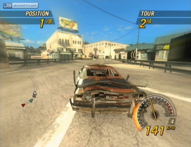 Ainsi donc les casse-cous de la première heure ne seront pas dépaysés par la conduite très arcade de ce FlatOut 2 qui puise sa force dans l’utilisation de la jauge de Nitro. A la manière des Burnout, des NFS Underground et bien d’autres jeux de courses encore, vous pouvez à tout moment pousser le régime moteur de votre bolide afin de grappiller quelques places supplémentaires grâce à une vitesse de pointe améliorée. Mais comme toutes les bonnes choses, il ne faut pas être trop gourmand. A défaut de faire une crise de foie, vous allez crier famine en martelant comme un beau diable le bouton de boost. Et c’est là l’aspect doucement stratégique de la série : savoir utiliser à bon escient cette énergie épuisable. Si d’emblée, on a tendance à appuyer sur le champignon en pleine ligne droite pour griller ses adversaires, c’est souvent peine perdue car eux aussi ont la même technique de jeu. Il est donc plus intelligent de booster lorsque ces derniers ne s’y attendent pas. Donc si accélérer dans une avenue n’est pas la meilleure solution, mettre la gomme en amorçant un virage peut s’avérer fort utile pour ne pas perdre de vitesse et gagner quelques km/h de plus au compteur. Un virage mal négocié et ce sont souvent 3, 4 voire 5 places que vous perdez en un instant. Bien que très arcade, il faut savoir bien décélérer dans une courbe pour mieux accélérer ensuite. Le frein ne sert vraiment qu’en dernier recours, lorsque votre voiture tire tout droit ou s’enfonce dans la nature après avoir percutée une barrière. Mais comment faire lorsque cette jauge d’accélération est à sec ou même dans un premier lieu réussir à la remplir ? Tout simplement en défonçant tout ce qui traîne sur votre passage. Qu’il s’agisse des décors destructibles des circuits ou des voitures adversaires, tout est bon à prendre de plein fouet. Il en est de même pour les sauts et les cascades involontaires. Plus la manœuvre est importante, plus la jauge se remplit. Pas besoin de sortir de l’ENA pour comprendre la vitesse est votre meilleure arme dans ce cas-là. Tout accident de la route est gratifié d’un nombre d’étoiles plus ou moins importants selon les dégâts infligés à vos concurrents. Chaque choc réduit la résistance des bagnoles jusqu’à l’explosion en course. A ce moment-là, à vous le pactole ! Cependant vous pouvez toujours tenter d’éjecter les pilotes adversaires en bourrinant leur carrosserie. Cela dit il n’est pas simple d’y arriver car eux aussi feront tout pour vous mettre en pièce, n’hésitant pas à braquer subitement dans votre direction même si vous êtes coincé contre un mur. Ils sont tout aussi vicieux que vous l’êtes mais faites attention aux excès car une mauvaise appréciation des distances ou des décors et c’est votre avatar qui s’écrasera sur le bitume. Autant dire que les championnats sont plus qu’excitants et les revirements de situation nombreux. D’autant plus nombreux que certains tracés se terminent en véritables boucheries. Quelques tours de circuits suffiront à transformer votre caisse en épave. La gestion des dégâts sur la carlingue rend hommage à vos prises de risque même si on regrette parfois quelques bugs d’affichage comme le pare-choc qui se traîne derrière vous alors qu’il est complètement détaché ou encore la portière qui s’enchevêtre dans la carcasse. Des petits détails que l’on retrouve bien trop souvent en courses.