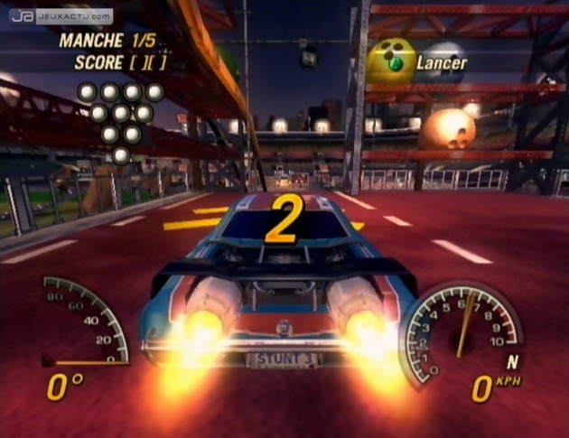 Parlons-en des courses ! Le Mode Carrière se découpe en trois épreuves bien distinctes : Derby, Courses et Rues. Au fur et à mesure de votre progression, vous pourrez concourir sur des circuits de plus en plus urbains et utiliser des bagnoles bien plus impressionnantes. Mais d’abord, vous devrez vous faire la main avec des voitures de Derby, tout rouillées, prêtes à rendre l’âme à tout moment et sentant le chien mouillée. Au défaut d’être esthétiques, elles ont le mérite d’être suffisamment robustes pour tenir 3 à 4 laps à la différence des automobiles de courses ou des sportives plus rapides mais aussi plus fragiles. Et si vous commencez avec un vieux tacot, sachez qu’il sera possible par la suite d’en acheter des nouveaux mais aussi d’améliorer leurs compétences en faisant un détour par le Mode Atelier Améliorations. Freins, moteur, suspensions, boîte de vitesse, échappement, pneus et châssis permettront un gain de vitesse ou d’une endurance. Cependant, certains choix réduiront d’autres statistiques. Quelques sacrifices sont donc envisageables. Pour pouvoir ramasser un maximum de thunes, c’est sur les circuits qu’il faudra faire ses preuves soit en remportant les différentes épreuves, soit en étant le plus rapide au tour ou soit en étant le plus dévastateur. Toujours est-il que même dans la défaite pour pouvez remporter une petite somme d’argent. Mais cela ne vous permettra pas de débloquer de nouveaux championnats, voitures ou évènements. Les évènements, ce sont ces petits défis déjà vus dans FlatOut qui permettaient d’expédier son pilote le plus haut, le plus loin et le plus fort possible sur des cibles. Et bien dans FlatOut 2, on retrouve ce même principe avec bien entendu des épreuves inédites. Aux côtés des arènes dignes de Destruction Derby, on retrouve le saut en hauteur, le bowling, le saut à ski, le curling, les anneaux de feu, le basket-ball, le royal flush, le football américain, la cible de fléchettes, le football ou le baseball. Bref rien de tel pour se décontracter le cerveau après un long championnat épuisant et crispant à cause de quelques défauts.