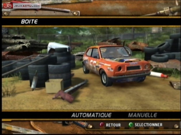 Exit les voitures classieuses et les grandes marques automobiles, un coup de peinture à la va vite sur ce qui peut faire office de véhicule et vous voilà parti. Ne vous embarrassez pas de néons et autres gadgets esthétiques, votre voiture ne va pas rester longtemps en l’état, le contraire eut été dommage. Confortablement assis (mais pas forcément pour longtemps) vous voilà donc parti à bord de votre engin, à arpenter des circuits improvisés en forêt, sur des chantiers de construction, des terrains gelés ou encore un village qui n’est pas sans faire penser à celui des Duke of Hazzard. Vous pourrez même faire quelques ‘pauses’ entre deux sur de vrais circuits pour faire cracher votre moteur dans de meilleures conditions. A l’exception de ce dernier type de parcours, ce n’est pas la vitesse pure qui vous permettra de gagner, mais votre gestion des trajectoires et la bonne utilisation des objets environnants. A l’instar de Burnout 3, chaque véhicule de FlatOut dispose en effet d’une jauge de nitro qui se remplira avec une conduite dangereuse. Ainsi, chaque heurt avec vos concurrents, mais surtout chaque destruction ou déplacements des éléments du décor vous rapportera le précieux NO2 avec un seul mot d’ordre, plus y’a de dégâts, plus vite elle se remplira. Les courses étant en permanence extrêmement serrées, et le turbo s’écoulant en une poignée de secondes, vous serez donc amené à reproduire constamment vos actes de démolition. Le jeu est alors extrêmement tourné vers les collisions et on le comprend, les développeurs sont fiers de leur choix de moteur physique et comptent bien nous le faire voir. A vous donc de forcer le passage pour être le premier à
