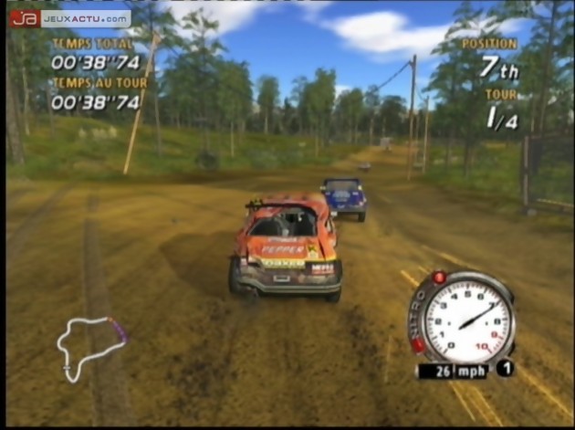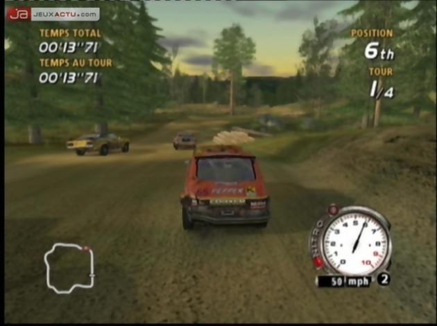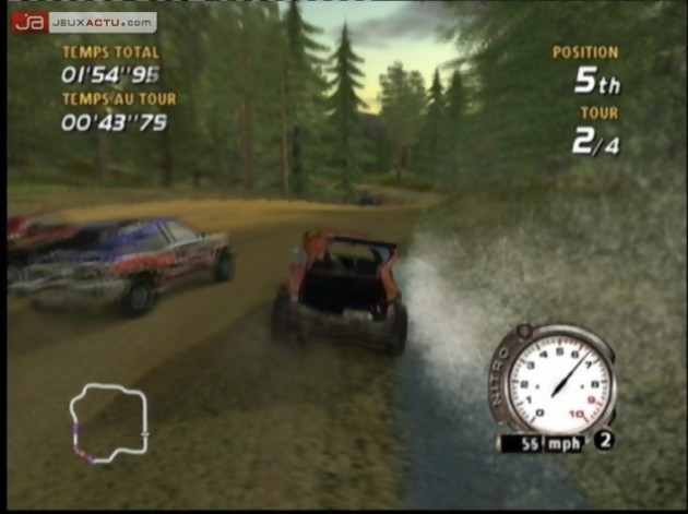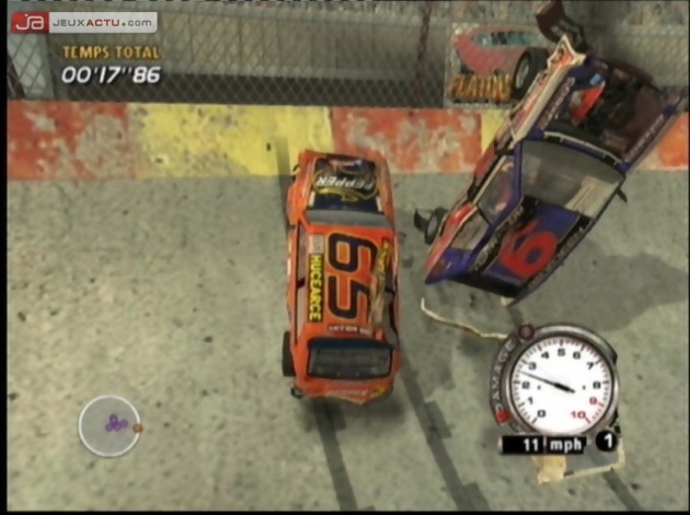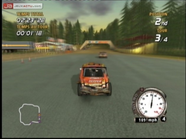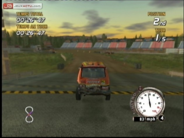 détruire les pyramides de tonneaux ou les panneaux publicitaires jonchant les bords des circuits. Attention toutefois, non seulement votre voiture est victime de la même physique (pare chocs, portières, capot et autres pièces se détacheront en fonction de vos exploits), mais tout ce qui fera office de défouloir pour votre folie destructrice restera sur le passage comme autant d’obstacles à éviter au tour suivant. Les tonneaux joyeusement renversés rouleront alors sur la piste et en prendre sous une roue à pleine vitesse pourra vous faire prendre un envol inattendu vous faisant perdre de précieuses secondes. Pour peu que cela vous arrive à quelques virages de l’arrivée et c’est le drame. Vous aurez beau être premier pendant quatre tours en croyant distancer vos adversaires, ils ne seront jamais bien loin et la moindre erreur sur la fin vous sera fatale. Le système d’handicap du jeu veut en effet que vous soyez toujours au cœur de la course, à proximité des concurrents, mais quelle frustration de se voir doublé par trois véhicules en même temps à 50 mètres de l’arrivée après avoir incroyablement dominé l’ensemble de l’épreuve. Heureusement, si l’handicap est poussé trop loin dans les premiers niveaux (mode bronze), il semble s’atténuer au fur et à mesure du jeu, jusqu’à enfin pouvoir distancer un minimum les concurrents pour peu que vous ayez pris soin de booster votre véhicule.