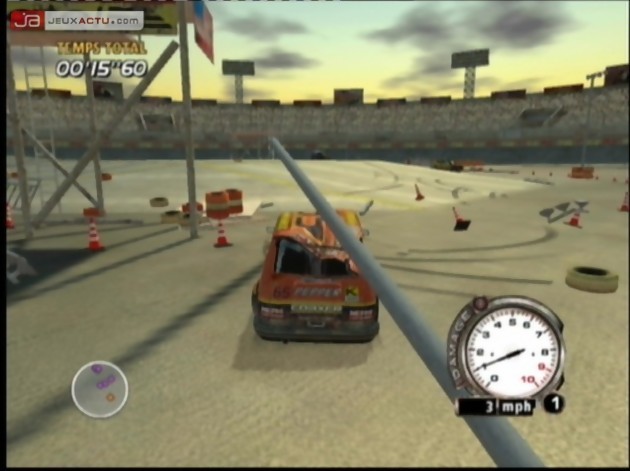 Au fur et à mesure que vous avancerez dans le jeu, vous débloquerez de nouveaux véhicules mais surtout de nouveaux modes, répartis en trois catégories. On trouve alors un mode survie purement tiré de Destruction Derby où vous devrez détruire aussi vite que possible l’ensemble des véhicules adverses, du stock car sur des anneaux de vitesse ou des circuits en huit boueux, et surtout, le point sensible du jeu soumis à controverse, le « rag doll » exploitant à outrance la défenestration du pilote à travers six mini jeux. L’indicateur de turbo se trouve alors remplacé par un indicateur d’angle d’éjection et la vitesse à laquelle vous vous fracasserez donnera la puissance du …jet. Volontaire ou non, le pilote ressemble plus à un pantin (d’où le doll de rag doll ?) et rapidement on prend le politiquement incorrect au second degré pour réellement s’amuser à faire traverser des cibles de fléchettes à notre chauffeur, le faire glisser sur une piste de bowling géante, ou encore lui faire atteindre des sommets dans une épreuve de saut en hauteur. Chacun de ses défis sera source de revenus pour une fois de plus upgrader la voiture et donc revenir sur chaque niveau pour améliorer encore et encore ses résultats.