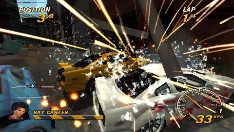 Si la PSP a déjà prouvé qu'elle était capable de sublimer certains titres développés sur consoles de salon - et particulièrement sur PlayStation 2 - en termes de réalisation, ce n'est pas vraiment le cas avec FlatOut : Head On. Non pas que le jeu soit moche ou laid, mais il manque cruellement de finition. Certaines textures sont grossières, et on pardonne difficilement le clipping à notre époque. Par ailleurs, l'animation souffre de quelques ralentissements, surtout en derby, et la sensation de vitesse est loin de donner le tournis. Malgré ces quelques désagréments, le car design de FlatOut : Head On se révèle correct, et les environnements sont truffés d'éléments destructibles qui voltigent dans tous les sens. Bref, la quintessence même de la franchise a été conservée, avec un habillage que l'on connaît sur le bout des doigts. Le concept de FlatOut : Head On n'a pas changé sur PSP, et il s'agira toujours de provoquer un maximum de dégâts dans des courses où les adversaires n'hésiteront pas à vous envoyer dans le décor. Les dommages subis n'influencent pas la conduite du véhicule qui demeure très arcade, même s'il faudra s'appliquer à freiner pour négocier correctement les virages, tellement la direction est sensible. En mode Course, il faudra utiliser astucieusement la nitro pour franchir la ligne d'arrivée en tête. Fracasser des lampadaires, briser des cabanes, ou bien encore pulvériser des vitrines font partie des nombreux moyens qui permettent de remplir sa jauge de nitro. En Derby Deathmatch, le but premier sera de flinguer le plus de voitures possible, en encaissant le minimum de dégâts naturellement. Pour y parvenir, différents items apparaissent de façon aléatoire dans l'arène. A vrai dire, on a déjà vu mieux dans le genre, d'autant plus que l'on aurait préféré la présence de véritables armes pour simplifier le déroulement des parties. Le Wrecking Derby est une variante de la discipline, où il faudra cette fois tout faire pour être le dernier en piste. FlatOut : Head On rengorge aussi d'une douzaine de mini-jeux dignes des Jackass : The Game - ou PAIN, c'est selon - où le pilote servira de projectile pour claquer des records. Après avoir ajusté parfaitement l'angle de lancer, le personnage ira s'accrocher sur un grillage à plusieurs mètre de hauteur, ou tentera de renverser plus de quilles possible, comme au bowling. Notre coup de coeur est allé à l'exercice du coup franc, où il faut essayer de marquer un but en évitant le mur placé devant la cage. Pour finir le tour des différents modes de jeu présents dans l'UMD, on n'oubliera pas le mode Carnage qui représente le coeur du jeu. Pas moins d'une quarantaine de défis à relever figurent au tableau, de quoi assurer une bonne durée de à vie FlatOut : Head On. Ici, les compétitions sont divisées en trois catégories - Derby, Course, Route -, ce qui contraint le joueur à sélectionner un type de véhicule précis pour chacune des épreuves. Cette restriction est un moyen de rentabiliser le système des crédits remis à la fin de chaque course, pour aller les dépenser ensuite à la concession. Là-bas, on peut se procurer n'importe quel modèle de véhicule. Comme d'habitude, des critères - vitesse de pointe, accélération, comportement, résistance, poids, nitro - permettent de guider le choix du pilote. Le multijoueur, quant à lui, autorise des parties jusqu'à quatre via le Wi-Fi, en Derby et en Course. Complet jusqu’au bout.
