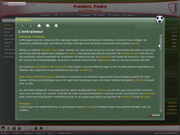 La gestion footballistique est un univers particulier. Les développeurs doivent faire un compromis difficile voire choisir parfois un parti pris entre convaincre les néophytes par une accessibilité accrue ou satisfaire la communauté existante avec davantage de profondeur de jeu. L’interface a donc été un peu repensé et un peu plus coloré pour l’occasion. Le résultat reste tout de même assez austère et il faut vraiment être un habitué pour pouvoir prendre ses marques. Pour la peine, le didacticiel pourra vous éclairer sur certains points. Il s’agit simplement d’une description où l’on peut naviguer grâce aux mots-clés en surbrillance.