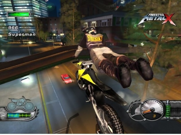 Pour tous ceux qui auront échappé à la vague Jackass, sachez que ce cher Johnny est l’un des protagonistes d’une merveilleuse émission américaine. Son but : tenter des challenges aussi périlleux que stupides. Si j’évoque cette série, c’est bien évidemment parce que Freestyle Metal X s’en inspire quant à l’ambiance. Rassurons les âmes sensibles dans l’assistance, il ne sera nullement question de sniffer des vers de terre, de frapper son paternel ou encore de faire la cible humaine à des novices du paintball. Ici, tous les challenges concernent vos aptitudes de pilote dans des situations cocasses et des endroits extravagants. Freestyle Metal X n’est pas avare en dépaysement car le jeu propose 12 niveaux, qu’il faudra débloquer au fur et à mesure. Pour en citer quelques-uns et pour annoncer la couleur, vous visiterez Heavy Metal, Snow Stormer, Downtown Destruction ou bien Skull Valley. Loufoques et immenses, les niveaux fourmillent de passages différents où liberté est le maître mot. Rien ne vous résiste, la moindre bosse ou dénivellation est sujette à un saut majestueusement acrobatique pour atterrir sur le toit d’un bâtiment ou tout simplement dans une zone qui vous est totalement inconnue. Freestyle Metal X joue énormément sur cette profondeur qui n’est pas sans rappeler cette bonne vieille série des Motocross Madness. Mais revenons à nos moutons : la jackass-attitude. Vous vous en doutez sûrement, l’ami Tony Hawk rôde dans les parages à la vue du titre de ce paragraphe. Effectivement le produit star de Neversoft a laissé sa marque de fabrique et chacun l’exploite à sa guise. Dans le cas de Freestyle Metal X, c’est au niveau du Mode Carrière que cela se ressent. On gère l’évolution professionnelle d’un pilote en réalisant divers challenges, en empochant de l’argent et en développant sa bécane. Au menu, vous allez évidemment devoir faire des scores max, des gaps et autres figures peu originales. Rien de bien exaltant à première vue. Maintenant intégrez à ces challenges primaires un ranch à taureaux, une dizaine de camions alignés, une meute de loups, des pilotes en herbes ou un trafic urbain. Là tout de suite, le cerveau palpite de plaisir. Excellent mélange entre originalité et difficulté croissante, Freestyle Metal X propose en outre des modes comme Fléchettes Humaines. Pour faire simple, chevauchant votre bécane vous devez vous jeter dans un cratère afin de faire un maximum de points. Seul problème, celui est plutôt loin et il va falloir éviter les mines qui se baladent librement sur la map tout en amassant les bonus, eux aussi aléatoirement placés. Comme quoi Freestyle Metal X n’aura jamais été aussi proche de Jackass.