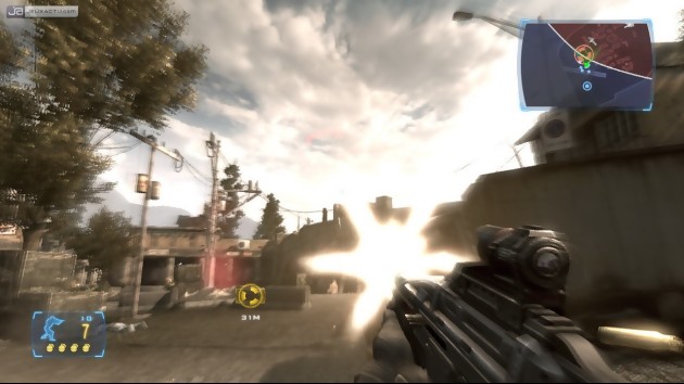 C’est évidemment le prétexte tout trouvé par les scénaristes de Frontlines : Fuel of War pour nous envoyer au front, la rage au ventre et surtout l’index sur la gâchette, prêt à éliminer le premier ennemi qui tenterait de prendre la fuite. Si le choix de l’allégeance est offerte dans le mode multijoueur, la Coalition Occidentale est imposée d’emblée en solo. Première faute de goût du jeu, sans gravité bien évidemment, mais il aurait été plus judicieux et surtout plus équitable d’avoir le choix de son écusson avant de partir en guerre. Peu importe, puisque cette aventure solitaire improvisée n’est qu’une variante dirigiste à peine déguisée de ce qu’on trouve en multi. Mais ne jetons pas la pierre aux membres de Kaos Studios, l’intention est louable puisque leur rejeton a été avant tout développé pour le jeu à plusieurs, et en ligne de surcroît. Les objectifs sont eux aussi peu ou prou les mêmes, étant donné qu’il s’agit d’avancer sur la carte en capturant des points stratégiques et en utilisant la force si possible. Pour ce faire, l’arsenal mis à disposition est conséquent, que l’on évolue à pieds ou à bord d’un véhicule tout terrain ou un char blindé. Plusieurs classes distinguent également les fantassins et en fonction du statut, les armes proposées diffèrent, il y va de soi. Mais c’est surtout l’utilisation de drones télécommandés qui confère à Frontlines : Fuel of War un certain cachet. En effet, certaines situations nécessitent l’aide ces engins miniatures capables de débloquer une situation qui paraît aux premiers abords hautement délicate. L’hélicoptère miniature par exemple est l’ami idéal pour allumer les soldats embusqués, ceux qui ont la fâcheuse tendance de se cacher derrière un mur ou un élément du décor. La petite voiture à quatre roues motrices à l’inverse se montre efficace pour passer sous les blindés et les faire exploser de la plus belle des manières. Des appareils offerts avec générosité et abondance, ce qui permet aux moins doués de s’y reprendre à plusieurs reprises s’ils venaient à manquer leur cible. Attention néanmoins à lancer ces assauts dans un endroit sûr, votre soldat se retrouve à la merci de n’importe quelle balle perdue lorsqu’il fait joujou avec ces engins mécaniques.