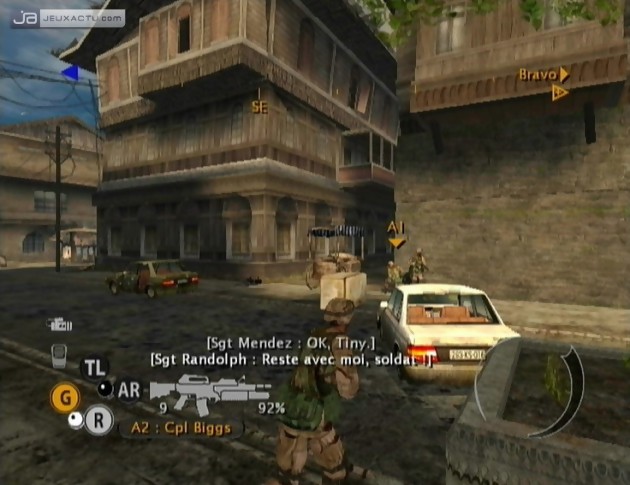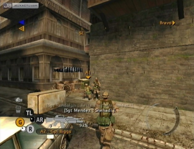 Maintenant que les déplacements des équipes Alpha et Bravo vous sont familiers, on passe aux séquences de tirs qui bénéficient de quelques nouveautés. Si d’accoutumée, le réticule de visée (X) permet soit d’enclencher un tir de couverture, soit de lancer une grenade à fragmentation ou encore de balancer des fumigènes, désormais il est possible le temps d’un instant de viser avec précision les ennemis avec un seul soldat. Que vous préfériez le mitrailleur, le grenadier, le fusilier ou simplement le chef d’équipe, vous pouvez en maintenant R enfoncé basculer en affichage FPS avec pour seule indication le viseur. Selon votre choix, vous pourrez détruire facilement des stocks de munitions, indiquer une cible pour une frappe aérienne ou tout simplement éliminer un moudjahiddine bien planqué. Cependant, pour éviter une certaine facilité de jeu, lorsque vous avez verrouillé votre cible, la mire à l’écran change de couleur et affiche un point rouge qui fera mouche si vous appuyez sur A. Il faut donc être patient pour réussir son coup mais le revers de la médaille, c’est que votre soldat est exposé aux tirs hostiles malgré le canardage de ses collègues. Vous pensiez vraiment avoir le beurre, l’argent du beurre et… et c’est déjà pas mal ! Parmi les quelques, et rares, nouveautés de Full Spectrum Warrior : Ten Hammers, on note l’apparition de véhicules, à savoir les Bradleys, ces fameux blindés américains, qui se contrôlent de la même manière que vos soldats. Le bouton X servant arroser une zone grâce à la mitrailleuse installée sur le toit du véhicule tandis que le R permet de tirer en utilisant le canon principal et d’autant plus destructeur qu’il est long à recharger. Avec ce collectif, vous avez de quoi planifier vos attaques via des manœuvres de contournement (pour prendre les ennemis à revers pendant qu’une équipe fait diversion avec un tir de couverture) principale technique de jeu de la série. Vous pouvez même vous amuser à scinder chaque formation en deux groupes de deux combattants pour doubler ou quadrupler vos interventions. Bien évidemment, à être moins nombreux, les soldats sont beaucoup plus vulnérables. Et si par malheur, vous perdez un de vos gars sur le champ de bataille, vous avez toujours le moyen de venir à sa rescousse et de le transporter jusqu’à un bâtiment ou une antenne médicale. Dans ce cas-là, un militaire se dévoue en rangeant son armada pour porter le mutilé jusqu’à bon port. Même dans le tragique, il faut avoir des nerfs d’acier et une bonne dose de sang pour gérer les unités au sol Alpha et Bravo, et les forces blindées Charlie et Delta.