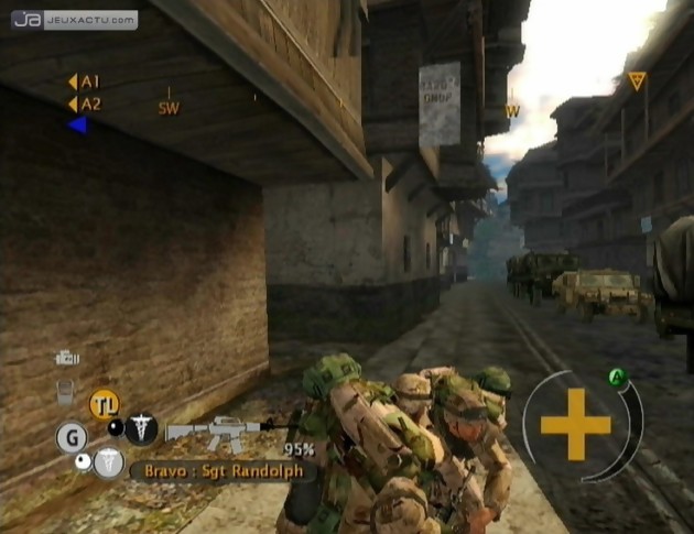 Maintenant que les déplacements des équipes Alpha et Bravo vous sont familiers, on passe aux séquences de tirs qui bénéficient de quelques nouveautés. Si d’accoutumée, le réticule de visée (X) permet soit d’enclencher un tir de couverture, soit de lancer une grenade à fragmentation ou encore de balancer des fumigènes, désormais il est possible le temps d’un instant de viser avec précision les ennemis avec un seul soldat. Que vous préfériez le mitrailleur, le grenadier, le fusilier ou simplement le chef d’équipe, vous pouvez en maintenant R enfoncé basculer en affichage FPS avec pour seule indication le viseur. Selon votre choix, vous pourrez détruire facilement des stocks de munitions, indiquer une cible pour une frappe aérienne ou tout simplement éliminer un moudjahiddine bien planqué. Cependant, pour éviter une certaine facilité de jeu, lorsque vous avez verrouillé votre cible, la mire à l’écran change de couleur et affiche un point rouge qui fera mouche si vous appuyez sur A. Il faut donc être patient pour réussir son coup mais le revers de la médaille, c’est que votre soldat est exposé aux tirs hostiles malgré le canardage de ses collègues. Vous pensiez vraiment avoir le beurre, l’argent du beurre et… et c’est déjà pas mal ! Parmi les quelques, et rares, nouveautés de Full Spectrum Warrior : Ten Hammers, on note l’apparition de véhicules, à savoir les Bradleys, ces fameux blindés américains, qui se contrôlent de la même manière que vos soldats. Le bouton X servant arroser une zone grâce à la mitrailleuse installée sur le toit du véhicule tandis que le R permet de tirer en utilisant le canon principal et d’autant plus destructeur qu’il est long à recharger. Avec ce collectif, vous avez de quoi planifier vos attaques via des manœuvres de contournement (pour prendre les ennemis à revers pendant qu’une équipe fait diversion avec un tir de couverture) principale technique de jeu de la série. Vous pouvez même vous amuser à scinder chaque formation en deux groupes de deux combattants pour doubler ou quadrupler vos interventions. Bien évidemment, à être moins nombreux, les soldats sont beaucoup plus vulnérables. Et si par malheur, vous perdez un de vos gars sur le champ de bataille, vous avez toujours le moyen de venir à sa rescousse et de le transporter jusqu’à un bâtiment ou une antenne médicale. Dans ce cas-là, un militaire se dévoue en rangeant son armada pour porter le mutilé jusqu’à bon port. Même dans le tragique, il faut avoir des nerfs d’acier et une bonne dose de sang pour gérer les unités au sol Alpha et Bravo, et les forces blindées Charlie et Delta.