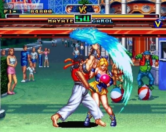 En 1995, la baston 2D vivait ses plus beaux jours. Les balbutiements de la 3D avec les premiers jeux sur PlayStation et Saturn ne faisaient que renforcer l’avis mitigé des joueurs élevés aux pixels et habitués à voir des jeux tourner sur cartouches. SNK qui frimait à l’époque avec sa Neo Geo débordait d’idées, si bien qu’entre deux épisodes de King of Fighters, le studio japonais décida de sortir une toute nouvelle licence, patchwork de tout ce que SNK savait faire à l’époque. Voilà donc en quelques mots comment est né le projet Savage Reign, aussi connu au Japon sous l’appellation originale Fu-un Mokushiroku. L’année suivante, SNK réitérait l’expérience en sortant Fu-un : Super Tag Battle, une suite qui, comme son nom l’indique, proposait un système de combat en tag, en d’autres termes en équipe avec la possibilité de switcher d’un personnage à un autre. La licence n’ira malheureusement pas plus loin, le public n’ayant pas été très réceptif à l’époque, préférant largement les épisodes de KOF, Samurai Spirits et Fatal Fury, les trois séries phares de la firme. Produit à de petites quantités, la cartouche AES de Kizuna Encounter se vend aujourd’hui à plus de 10 000 € sur les sites d’échanges en ligne type eBay, ce qui fait de lui le jeu le plus cher et recherché de l’Histoire du jeu vidéo. Rien que ça !
