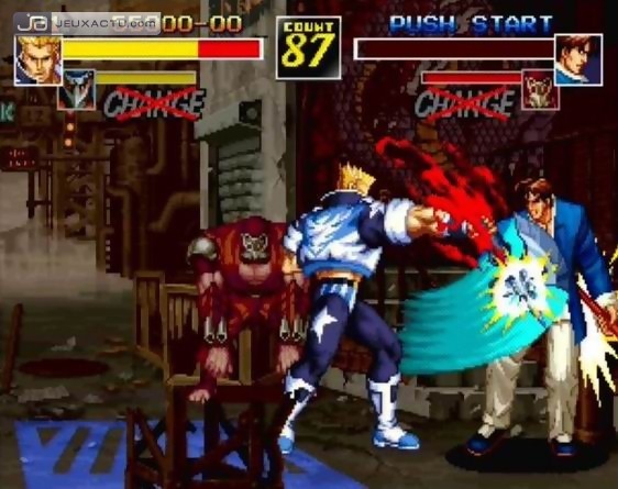 En 1995, la baston 2D vivait ses plus beaux jours. Les balbutiements de la 3D avec les premiers jeux sur PlayStation et Saturn ne faisaient que renforcer l’avis mitigé des joueurs élevés aux pixels et habitués à voir des jeux tourner sur cartouches. SNK qui frimait à l’époque avec sa Neo Geo débordait d’idées, si bien qu’entre deux épisodes de King of Fighters, le studio japonais décida de sortir une toute nouvelle licence, patchwork de tout ce que SNK savait faire à l’époque. Voilà donc en quelques mots comment est né le projet Savage Reign, aussi connu au Japon sous l’appellation originale Fu-un Mokushiroku. L’année suivante, SNK réitérait l’expérience en sortant Fu-un : Super Tag Battle, une suite qui, comme son nom l’indique, proposait un système de combat en tag, en d’autres termes en équipe avec la possibilité de switcher d’un personnage à un autre. La licence n’ira malheureusement pas plus loin, le public n’ayant pas été très réceptif à l’époque, préférant largement les épisodes de KOF, Samurai Spirits et Fatal Fury, les trois séries phares de la firme. Produit à de petites quantités, la cartouche AES de Kizuna Encounter se vend aujourd’hui à plus de 10 000 € sur les sites d’échanges en ligne type eBay, ce qui fait de lui le jeu le plus cher et recherché de l’Histoire du jeu vidéo. Rien que ça !