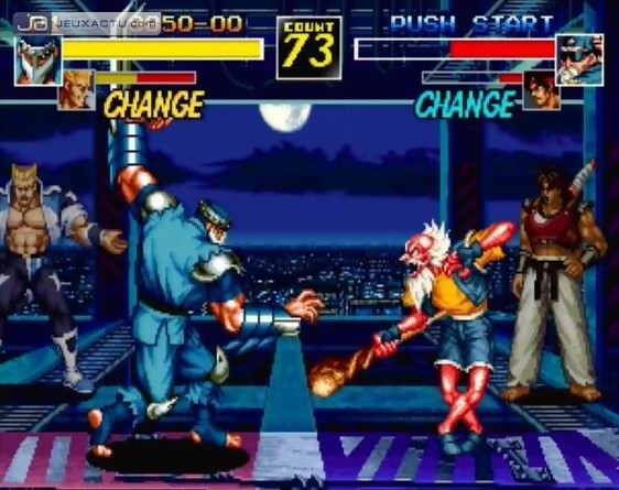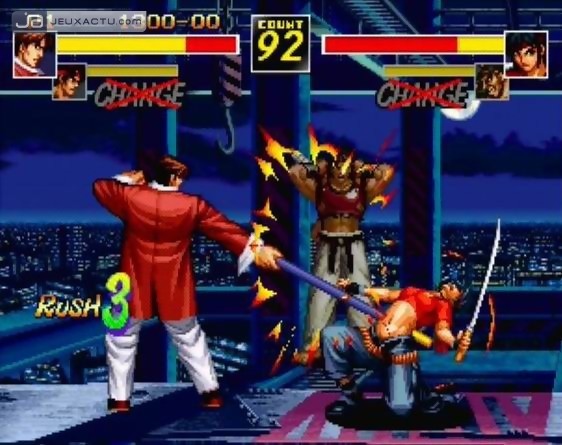 En 1995, la baston 2D vivait ses plus beaux jours. Les balbutiements de la 3D avec les premiers jeux sur PlayStation et Saturn ne faisaient que renforcer l’avis mitigé des joueurs élevés aux pixels et habitués à voir des jeux tourner sur cartouches. SNK qui frimait à l’époque avec sa Neo Geo débordait d’idées, si bien qu’entre deux épisodes de King of Fighters, le studio japonais décida de sortir une toute nouvelle licence, patchwork de tout ce que SNK savait faire à l’époque. Voilà donc en quelques mots comment est né le projet Savage Reign, aussi connu au Japon sous l’appellation originale Fu-un Mokushiroku. L’année suivante, SNK réitérait l’expérience en sortant Fu-un : Super Tag Battle, une suite qui, comme son nom l’indique, proposait un système de combat en tag, en d’autres termes en équipe avec la possibilité de switcher d’un personnage à un autre. La licence n’ira malheureusement pas plus loin, le public n’ayant pas été très réceptif à l’époque, préférant largement les épisodes de KOF, Samurai Spirits et Fatal Fury, les trois séries phares de la firme. Produit à de petites quantités, la cartouche AES de Kizuna Encounter se vend aujourd’hui à plus de 10 000 € sur les sites d’échanges en ligne type eBay, ce qui fait de lui le jeu le plus cher et recherché de l’Histoire du jeu vidéo. Rien que ça !