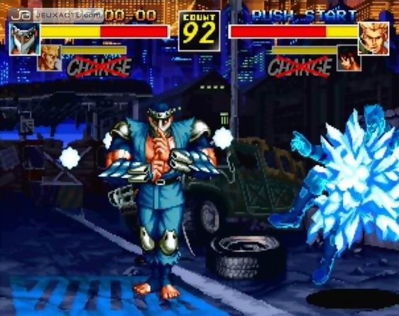 Nonobstant un résultat bien mitigé, SNK donnera une suite à Savage Reign l’année suivante, sous le nom de Kizuna Encounter : Super Tag Battle. Visiblement conscients des défauts du premier épisode, les développeurs ont grandement revu leur copie, quitte à faire l’impasse sur certains éléments. Exit le système de plan alternatif, SNK a désormais opté pour le Tag Battle. Un système qui sera repris dans l’excellent KOF XI, paru tout récemment sur PS2, et qui permet de permuter de partenaire en appuyant tout simplement sur une même touche. Le changement de persos n’étant pas bridé comme dans ce dernier, les matchs dans Kizuna Encounter : Super Tag Battle gagnent alors en punch, ce qui tranche radicalement avec la lenteur de Savage Reign. Avant le début de chaque match, le joueur est donc invité à créer son équipe de deux combattants, parmi les dix proposés. Un nombre toujours aussi faiblard, même pour l’époque et ce malgré l’apparition de deux nouvelles têtes : Kim Sue-il, un descendant de Kim Kaph Wan et Rosa, une excellente combattante maniant le sabre à la perfection. Si Kizuna Encounter : Super Tag Battle a gagné en intensité par rapport à Savage Reign, le titre souffre néanmoins d’un manque flagrant de variété en ce qui concerne les attaques et autres combos. Dommage car le système d’esquive hérité de Samurai Spirits III – permettant d’éviter une attaque et de passer dans le dos de son adversaire – ouvre des opportunités bien intéressantes. Mais ce sont peut-être tous ces éléments repris des sagas fétiches de SNK qui empêchent Savage Reign et Kizuna Encounter : Super Tag Battle de se démarquer de toutes ces productions uniques. L’originalité, parfois, ça aide.