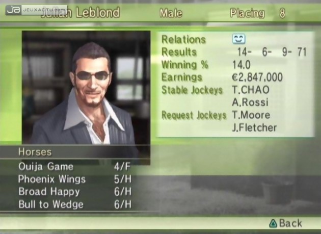 Les sports hippiques étant particulièrement populaires au pays du Soleil-Levant, Koei prend le risque d’importer la série G1 Jockey via l’épisode 4. Pour ceux qui ne le savent pas encore, sachez que ce genre de production nous place dans la peau d'un jockey et fait donc un peu figure d'OVNI du côté de l’Hexagone. La curiosité a donc été forte mais cette expérience s'est révélée assez décevante. En effet, sur le plan de la réalisation, on ne peut pas dire que les développeurs ont placé la barre très haute. Tout est extrêmement pixellisé et les animations sont loin d'être extraordinaires. Et alors que des spots publicitaires actuellement diffusés sur les chaines hertzienne prônent de vivre l'intensité des courses hippiques, on est très loin de ressentir un tel dynamisme une fois dans la partie. Sur le plan technique, si on ne peut se permettre de rivaliser avec le jugement d'un amateur éclairé de la discipline, il nous semble que les nombreuses options soient bien intégrées. D'ailleurs, le jeu ne se montre pas vraiment accessible même si un tutorial est bel et bien présent pour initier les profanes à quelques subtilités. Le jeu étant intégralement dans la langue de Shakespeare, le didacticiel l'est également et il faudra bien quelques notions d'anglais pour s'en dépatouiller. Ce dernier est découpé en trois parties : la première vous enseignera les différents termes techniques à connaitre sur le bout des doigts, la seconde laissera la place à un peu plus de pratique sur le terrain et enfin la dernière phase permet de voir des démos de quelques stratégies pouvant être mis en place sur l'hippodrome pour remporter la victoire. Mais globalement, le succès ne dépend souvent que de votre faculté à bien composer avec les indicateurs renseignant sur l'état de fatigue, la vitesse ou encore la motivation de votre canasson et ainsi ne pas le cravacher au mauvais moment. G1 Jockey 4 se montre également assez avare sur les modes de jeux. On retrouve les sempiternelles courses libres - qui affichent une dizaine d'hippodromes renommés à parcourir à sa guise – et mode "Carrièree dans lequel on incarne un jeune jockey tout juste sorti de sa promotion scolaire souhaitant faire ses classes et dans lequel, quelques éléments de pseudo-gestion ont été intégrés.