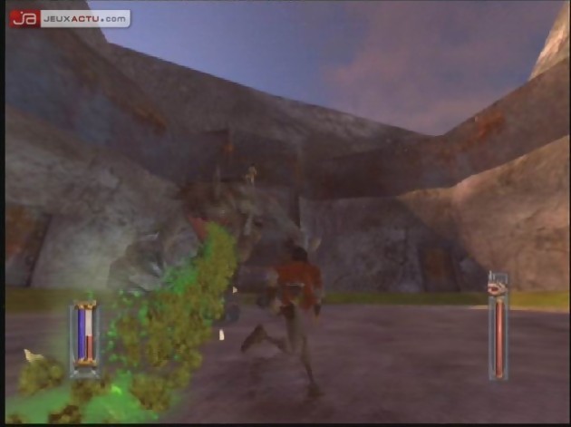 Prévu à l’origine sur la dernière console de Sega, Galleon ne semble pas avoir évolué d’un iota depuis cette époque. Les graphismes sont vilains, n’ayons pas peur des mots, et offrent des textures fadasses, plates et à la limite du flou. Rhama a beau être capable d’escalader un certain type de roche, on arrive à peine à distinguer les différentes parois tellement on se flingue les yeux à discerner quoi que ce soit. Bien sûr, ce n’est pas systématique, mais c’est fatigant. Ensuite, ça manque furieusement de détails. Tout est lisse, plat et anguleux comme sur PlayStation. La 1, pas la 2. Le jeu propose également un manque de finition aberrant en 2004. Tout le côté technique laisse donc franchement à désirer (mis à part les vois françaises, excellentes), mais c’est aussi la manière dont est racontée l’histoire, le manque de punch des cinématiques, voire l’absence de cinématiques lors de moments clés. Certains passages (trop ?) sont par exemple chronométrés : en cas de réussite, tout va bien, les événements s’enchaînent. Mais en cas d’échec, lorsque l’horloge atteint le zéro, paf, écran noir suivi d’un écran de chargement. Et vous revoilà propulsé au début de l’épreuve. On ne sait même pas ce qui passe, le jeu s’arrête, point barre. Rien de tel pour casser l’ambiance. Alors que le jeu est en développement depuis des années, il accuse de vrais défauts de jeunesse assez consternants.