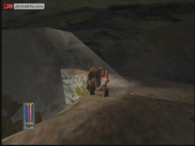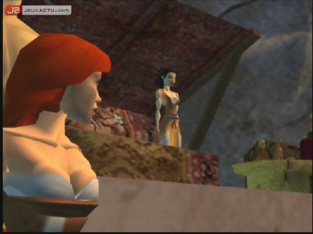 Prévu à l’origine sur la dernière console de Sega, Galleon ne semble pas avoir évolué d’un iota depuis cette époque. Les graphismes sont vilains, n’ayons pas peur des mots, et offrent des textures fadasses, plates et à la limite du flou. Rhama a beau être capable d’escalader un certain type de roche, on arrive à peine à distinguer les différentes parois tellement on se flingue les yeux à discerner quoi que ce soit. Bien sûr, ce n’est pas systématique, mais c’est fatigant. Ensuite, ça manque furieusement de détails. Tout est lisse, plat et anguleux comme sur PlayStation. La 1, pas la 2. Le jeu propose également un manque de finition aberrant en 2004. Tout le côté technique laisse donc franchement à désirer (mis à part les vois françaises, excellentes), mais c’est aussi la manière dont est racontée l’histoire, le manque de punch des cinématiques, voire l’absence de cinématiques lors de moments clés. Certains passages (trop ?) sont par exemple chronométrés : en cas de réussite, tout va bien, les événements s’enchaînent. Mais en cas d’échec, lorsque l’horloge atteint le zéro, paf, écran noir suivi d’un écran de chargement. Et vous revoilà propulsé au début de l’épreuve. On ne sait même pas ce qui passe, le jeu s’arrête, point barre. Rien de tel pour casser l’ambiance. Alors que le jeu est en développement depuis des années, il accuse de vrais défauts de jeunesse assez consternants.