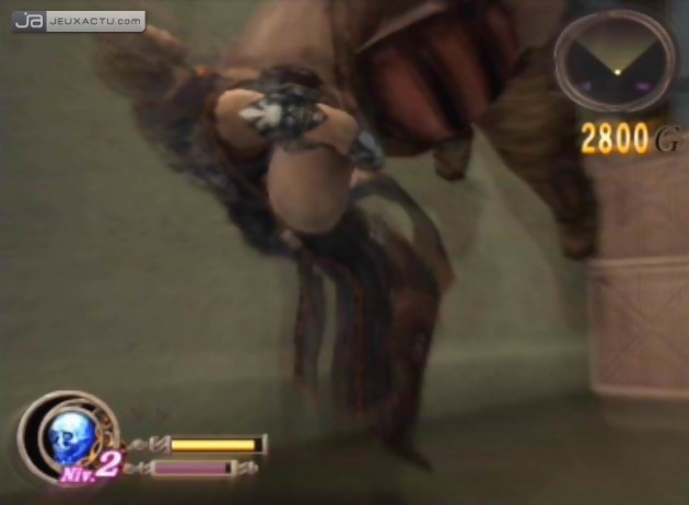 A l'instar des jeux de combat 3D actuels, certaines attaques possèdent des propriétés particulières, comme le guard crush pour briser une garde ou le launcher pour amorcer un air combo. La technique la plus efficace demeure tout de même le stun ; une fois l'adversaire dans les étoiles, on l'attrape avec Rond et on appuie comme un damné sur les boutons pour lui infliger le plus de dommages. Un brin amusant. A côté de ça, il y a la roulette qui donne accès à des pouvoirs encore plus dévastateurs. Il faut alors choisir l'attaque souhaitée tout en tenant compte du nombre de sphères dont l'on dispose. Enfin, on peut toujours faire appel au god hand, ce qui rend Gene invincible pendant la consommation de la barre, avec des attaques plus rapides et plus puissantes. La subtilité, s'il y en a une, est donc de jongler intelligemment entre la roulette et le god hand pour ne pas passer la plupart de son temps à mordre la poussière. Car le niveau de difficulté de God Hand pourra en rebuter certains, même en facile, avec des ennemis de plus en plus robustes au fil des missions. Les items régénérateurs que l'on trouve sur le chemin sont à consommer sans gourmandise donc, quitte à les laisser de côté pour venir les récupérer par la suite si le besoin s'en fait ressentir. Mais ce qui rend le jeu particulièrement hardcore et pratiquement injouable dans les phases de combat, c'est la caméra que l'on ne peut absolument pas contrôler. Du coup, on se retrouve avec une vue du dos inamovible, et l'obligation de tourner sur place pour faire face à l'ennemi. Certes, on peut toujours se servir de L1 pour faire un 180°, mais ça reste dans l'approximatif. Bref, mieux vaut prendre une centaine de mètres de marge avant de se retourner. Pas de lock ni de strafe, uniquement le stick analogique droit et ses esquives comme sortie de secours, à condition de connaître les propriétés des attaques adverses sur le bout des doigts. Et pour être franc, on se retrouve souvent à exécuter des side steps et des backflips pour se dégager d'une situation tendue, lorsque l'on se retrouve encerclé par trois ou quatre gaillards. Du coup, on se demande s'il n'aurait pas été plus judicieux de faire de God Hand un beat'em all avec un scrolling horizontal à l'ancienne, même si d'un point de vue marketing cela peut sembler rude de sortir un beat'em all 2D en 2007. Mais quand on a le courage d'imposer comme semi-boss des pseudo-Power Rangers...