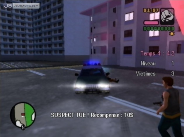 Au détour d’une ruelle, vous tomberez nez à nez face à une icône Rodéo qui vous oblige à massacrer un maximum de gangsters ou de bagnoles dans le temps imparti et avec une arme donnée. Et puis, bizarrement, vous remarquez la présence de ballons de baudruche sans y prêter attention avant de faire un détour dans le menu des statistiques. Et là, vous vous rendez compte qu’il s’agit d’un nouveau fil rouge pour GTA : Vice City Stories. Les paquets cachés ont disparu pour laisser leur place à ces ballons flottants qu’il faudra exploser à l’aide d’une arme à feu pour débloquer des flingues dans votre planque. Comme d’habitude, à chaque dizaine votre arsenal se remplit. Autant dire que repérer les 99 ballons ne sera pas chose facile car s’il était déjà difficile de mettre la main sur les 100 paquets de dopes planqués dans GTA : Vice City, ici vous devez vous baladez le nez en l’air pour les découvrir et qui plus est, il faut être armé. Et c’est souvent ce qui vous fait défaut lorsque vous vous faites alpaguer par les forces de l’ordre ou tuer par les cubains. Mais Rockstar Games a la solution pour pallier à ce problème, moyennant finance. En sortant du commissariat ou de l’hôpital vous pouvez récupérer vos armes contre un pot-de-vin de 2000$. Bien pratique surtout si l’on a passé des heures de jeu à récupérer un maximum de munitions en vue de taper une cosette musclée avec les gangs rivaux calfeutrés dans leurs bastions.