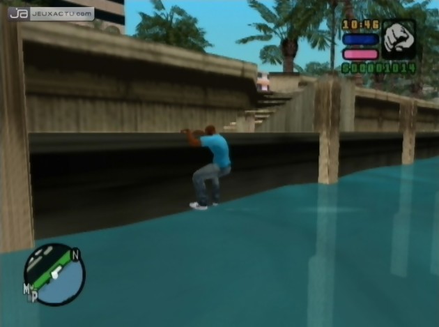 Au détour d’une ruelle, vous tomberez nez à nez face à une icône Rodéo qui vous oblige à massacrer un maximum de gangsters ou de bagnoles dans le temps imparti et avec une arme donnée. Et puis, bizarrement, vous remarquez la présence de ballons de baudruche sans y prêter attention avant de faire un détour dans le menu des statistiques. Et là, vous vous rendez compte qu’il s’agit d’un nouveau fil rouge pour GTA : Vice City Stories. Les paquets cachés ont disparu pour laisser leur place à ces ballons flottants qu’il faudra exploser à l’aide d’une arme à feu pour débloquer des flingues dans votre planque. Comme d’habitude, à chaque dizaine votre arsenal se remplit. Autant dire que repérer les 99 ballons ne sera pas chose facile car s’il était déjà difficile de mettre la main sur les 100 paquets de dopes planqués dans GTA : Vice City, ici vous devez vous baladez le nez en l’air pour les découvrir et qui plus est, il faut être armé. Et c’est souvent ce qui vous fait défaut lorsque vous vous faites alpaguer par les forces de l’ordre ou tuer par les cubains. Mais Rockstar Games a la solution pour pallier à ce problème, moyennant finance. En sortant du commissariat ou de l’hôpital vous pouvez récupérer vos armes contre un pot-de-vin de 2000$. Bien pratique surtout si l’on a passé des heures de jeu à récupérer un maximum de munitions en vue de taper une cosette musclée avec les gangs rivaux calfeutrés dans leurs bastions.