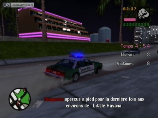 Mieux vaut être bien armé et équipé d’un gilet pare-balles pour affronter la situation. Qui plus est, vous pouvez assurer vos arrières en recrutant quelques gars de votre cartel. Mais les choses se compliquent sérieusement lorsque la police se mêle de vos affaires. Oubliez la facilité déconcertante d’un Saints Row, le retour à la réalité GTA est bien plus difficile car les flics ont gagné en agressivité. Il vous faudra beaucoup de courage et pas mal de chance pour atteindre le nombre d’étoiles de recherche maximal. Au premier niveau d’alerte, c’est finger in the nose. Les flics vous suivent timidement en bagnoles et les quelques motards zélés de la police tomberont de leur monture au moindre choc. Au deuxième niveau, les choses se compliquent rapidement avec des keufs qui ont gagné en précision de tirs et qui dégomment aussi vite que possible vos pneus lorsque vous fuyez en voiture. Rageant ! Alors avec 3 étoiles, les agents façon Miami Vice s’en donnent à cœur joie et les herses fleurissent à tout bout de champ. Imaginez le topo – sans tricher bande de petits malins ! – quand les swats, le FBI ou l’armée s’en mêlent, on rigole bien en repensant à Saints Row surtout que même la fuite en bagnole et devenu un calvaire. Habituellement, les policiers ne résistaient guère lorsque vous partiez sur les chapeaux de roue. Désormais, même pendant vos manœuvres, ils arrivent à vous arrêter. Le constat est pire avec les motos dès lors que vous les enfourchez. Grand Theft Auto : Vice City Stories n’est pas un parcours de santé en vadrouille ou en mission.