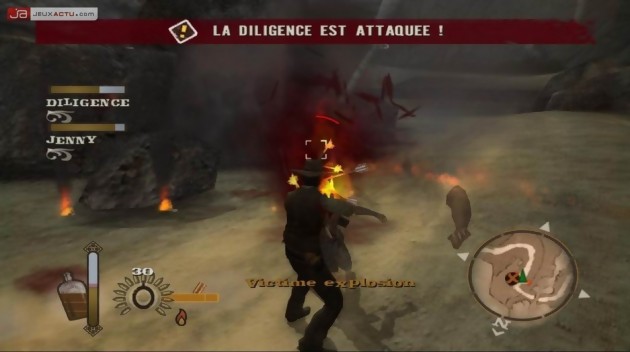 Pour le reste, c’est à pied que se déroulera le jeu puisqu’il est possible de pénétrer à l’intérieur de certains bâtiments pour discuter avec le tenancier d’un saloon ou bien encore de s'adresser au barman qui propose de temps à autre de faire quelques emplettes ou de s’informer sur d’éventuelles nouvelles qui circulent en ville. Ces personnages tiers sont visibles sur la boussole du jeu et sont indiquées par un point bleu, qui permet aussi de repérer des missions annexes comme cette fameuse séquence où il faut mener son troupeau de bovins d’un point A à un point B. Mais Gun fait également la part belle aux scènes d’action avec, vous l’imaginez, des gunfights comme on aime en voir dans les films de western. Si le jeu se déroule principalement en mode de vue à la troisième personne, il est possible de passer en vue subjective (R2). On passe alors en slow motion et l’action ralentit, permettant de tirer avec plus de précision. De même, pendant ce mode bullet time, une petite pression sur une direction permet de locker immédiatement un ennemi, ce qui permet au joueur de gagner du temps, chose précieuse sous le feu nourri de l’ennemi. Intuitif donc. Pas d’inquiétude à avoir cependant, Gun n’est pas un ersatz de Max Payne à la sauce Clint Eastwood, puisque le personnage Colton va évoluer au cours du jeu et de nombreuses missions optionnelles seront présentes pour booster ses caractéristiques. De plus, l’arsenal va s’améliorer au fil des missions pour atteindre la quarantaine d’armes upgradables disponibles, même si l’on peut uniquement porter un maximum de 4 armes et 2 types de grenades. Ce petit aspect RPG, couplé à la douzaine de changements d’aspect durant le jeu, concourt à faire de Gun un jeu à la variété évidente.