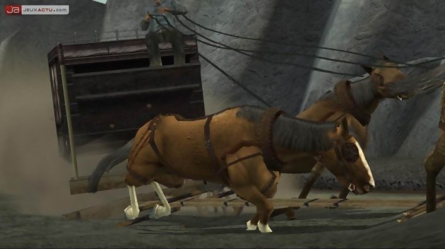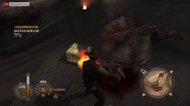Pour le reste, c’est à pied que se déroulera le jeu puisqu’il est possible de pénétrer à l’intérieur de certains bâtiments pour discuter avec le tenancier d’un saloon ou bien encore de s'adresser au barman qui propose de temps à autre de faire quelques emplettes ou de s’informer sur d’éventuelles nouvelles qui circulent en ville. Ces personnages tiers sont visibles sur la boussole du jeu et sont indiquées par un point bleu, qui permet aussi de repérer des missions annexes comme cette fameuse séquence où il faut mener son troupeau de bovins d’un point A à un point B. Mais Gun fait également la part belle aux scènes d’action avec, vous l’imaginez, des gunfights comme on aime en voir dans les films de western. Si le jeu se déroule principalement en mode de vue à la troisième personne, il est possible de passer en vue subjective (R2). On passe alors en slow motion et l’action ralentit, permettant de tirer avec plus de précision. De même, pendant ce mode bullet time, une petite pression sur une direction permet de locker immédiatement un ennemi, ce qui permet au joueur de gagner du temps, chose précieuse sous le feu nourri de l’ennemi. Intuitif donc. Pas d’inquiétude à avoir cependant, Gun n’est pas un ersatz de Max Payne à la sauce Clint Eastwood, puisque le personnage Colton va évoluer au cours du jeu et de nombreuses missions optionnelles seront présentes pour booster ses caractéristiques. De plus, l’arsenal va s’améliorer au fil des missions pour atteindre la quarantaine d’armes upgradables disponibles, même si l’on peut uniquement porter un maximum de 4 armes et 2 types de grenades. Ce petit aspect RPG, couplé à la douzaine de changements d’aspect durant le jeu, concourt à faire de Gun un jeu à la variété évidente.