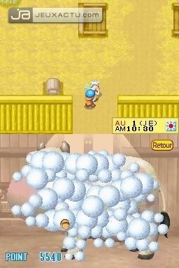 Alors que nous vivons aujourd’hui dans une société où tout produit est conditionné, où jardinage rime avec rayon primeur du supermarché, où légume est synonyme de boîte de conserve et où les repas s’apparentent à une barquette surgelée placée dans un four à micro-ondes, Harvest Moon DS nous propose un retour à la vie, la vrai. Comme ces aînés, il nous propose une aventure champêtre. A nous de gérer nos terres, d’y cultiver toutes sortes de produits, de tirer le maximum de nos animaux afin de prospérer. Le scénario, parce qu’il y en a un, débute avec les petites querelles quotidiennes entre Princesse Sorcière et la Déesse des récoltes. Las des moqueries de cette dernière, Princesse Sorcière va malencontreusement faire disparaître sa camarade de jeu avec un sort magique. Pour réparer son erreur, elle enverra 101 lutins de récolte à sa recherche. Bien entendu, nous nous retrouvons mêlés à cette histoire et lors de nos travaux de fermier, il nous faudra retrouver tout ce beau monde. Oui c’est très niais et toute cette mascarade n’est finalement qu’un prétexte à notre vie de fermier. Car ne nous leurrons pas, Harvest Moon DS n’est pas un jeu d’aventure scénarisé, il reste fidèle à ces prédécesseurs.
