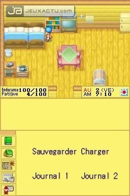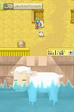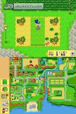 Le temps de prendre le coup (ce qui prendra quelques dizaines de minutes), et à vous les plaisirs ruraux. Défricher, labourer, semer, arroser, sera votre lot quotidien en attendant d’avoir des bêtes. Le concept est simple et a déjà fait ses preuves. Il fait d'ailleurs une nouvelle fois mouche. Comme dans tout jeux de gestion, la patience sera reine. Le développement est long et avant que vous n’en voyiez le bout, de l’eau aura coulé sous les ponts. Le soft jouit en effet d’un potentiel énorme, il fourmille de possibilités tant au niveau des cultures que de l’élevage. Au fil des heures, une finesse de gameplay énorme se révèle. Chaque élément de votre ferme ne demandera ni la même attention, ni la même patience. Tout est upgradable, de vos outils à votre maison, en passant par la qualité de vos récoltes. Une fois que vous serez assez expérimenté, à l’instar des précédents opus, il sera temps pour vous de partir à la conquête d’une jeune paysanne. Pour éviter la repompe bête et méchante d’une mécanique déjà bien huilée, Natsume a instauré dans cet opus un système d’aide fourni par les lutins de récolte. A mesure que vous les libérerez, ils soulageront votre labeur quotidien moyennant rémunération. Leur efficacité dépendra des liens que vous nouerez avec eux. Mais être fermier n’est pas fait pour les fainéants, il vous faudra définir vos besoins prioritaires. Diverses équipes aux compétences variées seront à votre disposition, mais une seule pourra travailler par jour. Le monde appartient à ceux qui se lèvent tôt, surtout à la campagne. Comme dans la vraie vie, rigueur et sueur seront les clés de votre succès. Et c’est là que le bas blesse. Malgré son immense richesse, seuls les joueurs ayant accroché au principe sauront faire face à la répétitivité du gameplay. Les journées se suivent et se ressemblent terriblement. Vous voilà prévenu. Techniquement, les développeurs ne se sont pas foulés. Coloré et mignon, on regrettera tout de même, la grande similitude avec la version GBA.