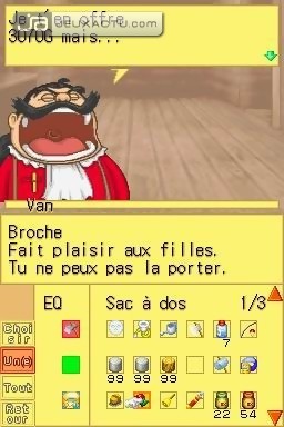 Alors que nous vivons aujourd’hui dans une société où tout produit est conditionné, où jardinage rime avec rayon primeur du supermarché, où légume est synonyme de boîte de conserve et où les repas s’apparentent à une barquette surgelée placée dans un four à micro-ondes, Harvest Moon DS nous propose un retour à la vie, la vrai. Comme ces aînés, il nous propose une aventure champêtre. A nous de gérer nos terres, d’y cultiver toutes sortes de produits, de tirer le maximum de nos animaux afin de prospérer. Le scénario, parce qu’il y en a un, débute avec les petites querelles quotidiennes entre Princesse Sorcière et la Déesse des récoltes. Las des moqueries de cette dernière, Princesse Sorcière va malencontreusement faire disparaître sa camarade de jeu avec un sort magique. Pour réparer son erreur, elle enverra 101 lutins de récolte à sa recherche. Bien entendu, nous nous retrouvons mêlés à cette histoire et lors de nos travaux de fermier, il nous faudra retrouver tout ce beau monde. Oui c’est très niais et toute cette mascarade n’est finalement qu’un prétexte à notre vie de fermier. Car ne nous leurrons pas, Harvest Moon DS n’est pas un jeu d’aventure scénarisé, il reste fidèle à ces prédécesseurs.